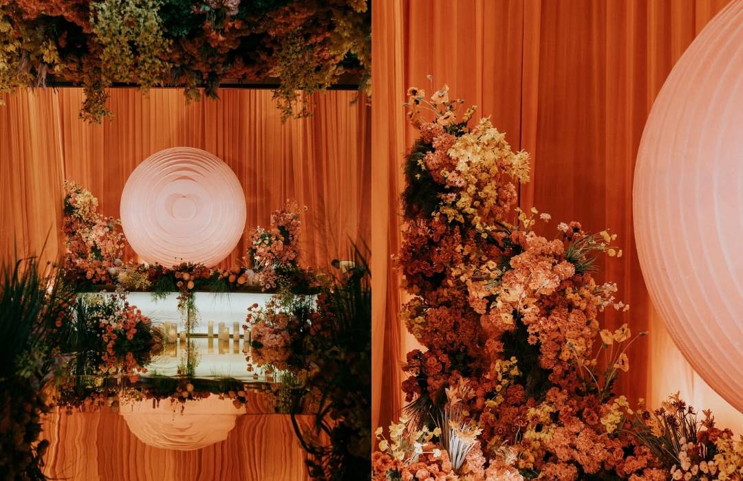 Cerah namun melankolis tanpa mengurangi nilai romantis, drapery dengan warna sunset orange bisa menjadi pilihan yang menarik sebagai backdrop resepsi atau Sangjit-mu. Pasang centerpiece yang eye catching untuk menambah nilai ikonik. Dekorasi dedaunan juga cocok sebagai warna pendukung dari warna utama dekorasi satu ini.