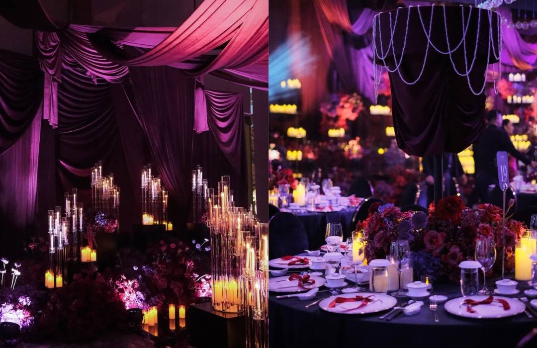 Jika mengarah pada zaman dahulu, warna ungu merupakan warna kemegahan dan kejayaan karena kelangkaannya. Warna ini bisa menjadi salah satu warna yang diperuntukkan sebagai warna utama sebuah pernikahan karena dianggap unik dan memiliki nilai spiritualitas yang tinggi. Drapery dengan warna ungu – atau yang kami sebut sebagai warna yang majestic, akan semakin elegan ditambah dengan warna dark pink/fuchsia yang memiliki intensitas warna yang sama untuk menambahkan efek kebahagiaan sebuah selebrasi cinta yaitu pernikahan.