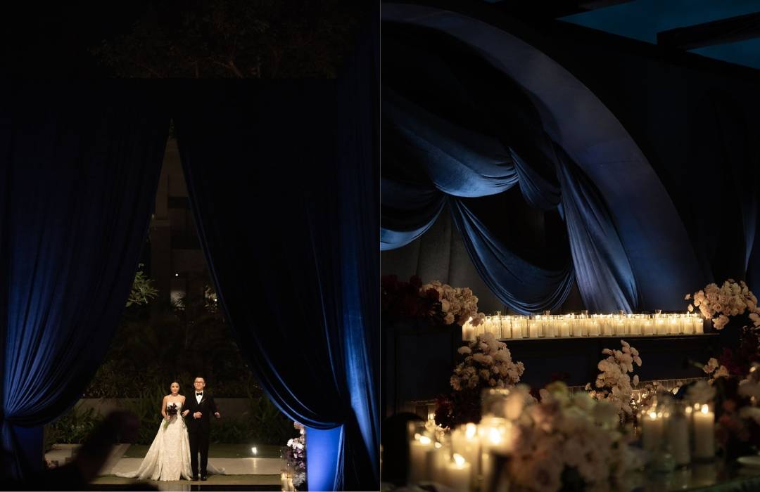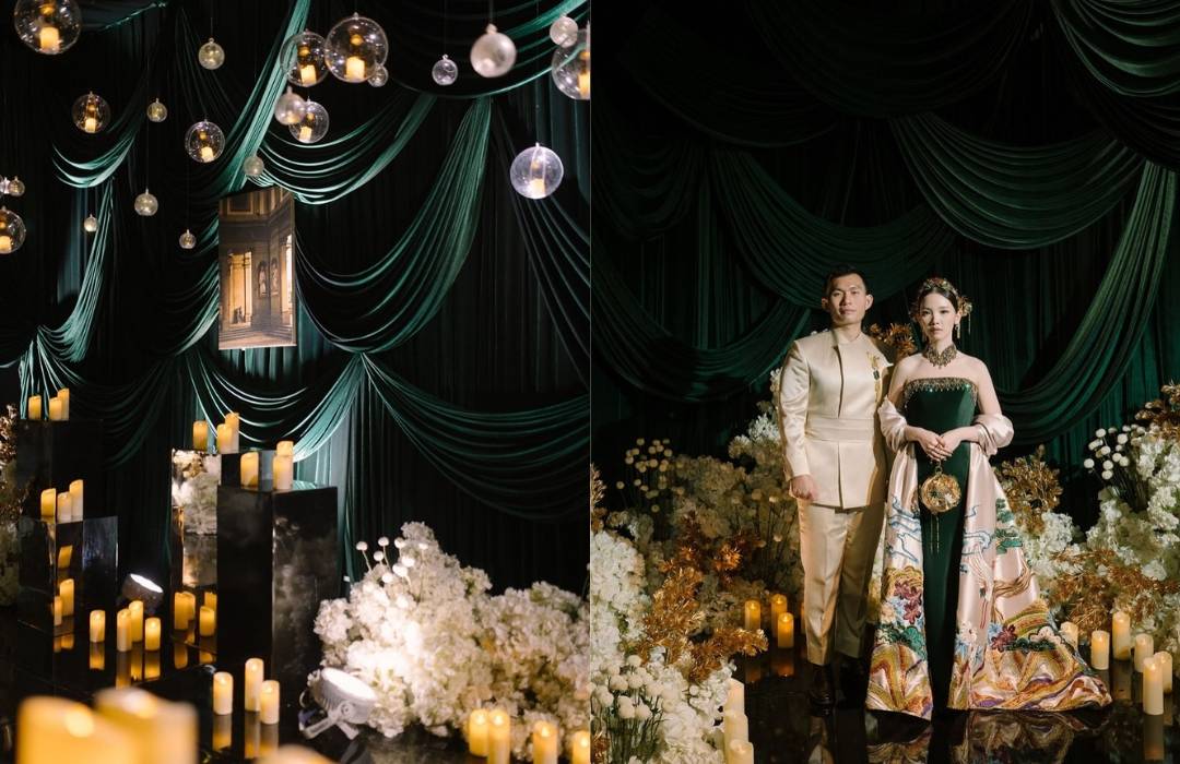 Bagai warna perhiasan emerald yang rare dan mewah, drapery velvet dengan warna dark green siap menghiasi resepsi atau Sangjit-mu dengan kesan dark yang memesona. Tambahkan dekorasi light bulb atau candle untuk menciptakan kesan kontras untuk menyeimbangkan suasana. Dekorasi bunga berwarna putih juga mampu membantu meng-create kesan balance.