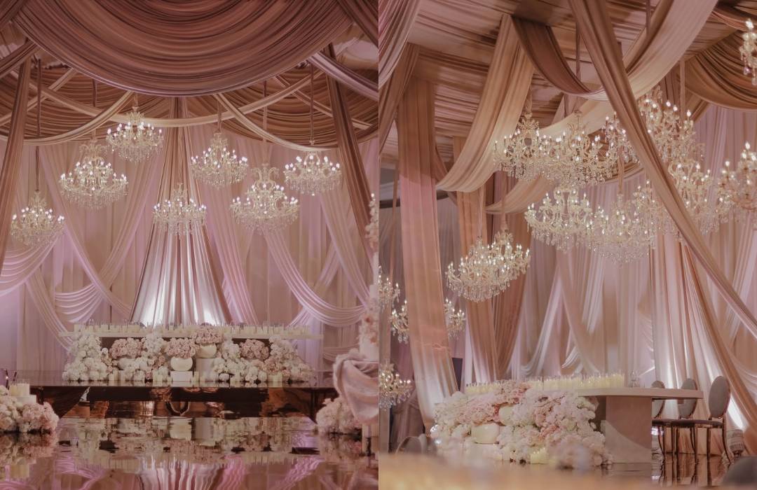 Elemen ini ialah drapery. Drapery sendiri biasanya dijadikan sebagai backdrop untuk venue sebagai sebuah statement trendy. Drapery ini merupakan kain yang jatuh menjuntai dan membentuk lipatan-lipatan cantik untuk menghiasi setting. Tak hanya dalam dekorasi, elemen drapery ini juga diaplikasikan pada berbagai attire wedding salah satunya adalah gaun-gaun untuk pemberkatan, Akad, atau resepsi.