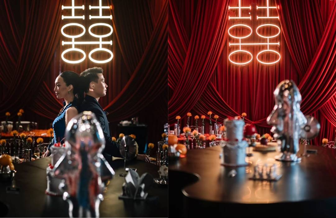 Dibanding merah terang, drapery dengan warna deep red mencerminkan suasana yang lebih dramatis dan mewah, apalagi ditambah bahan velvet yang memang diperuntukkan sebagai simbol dari glamor. Warna ini cocok menghiasi Sangjit yang mana warna merah dianggap sebagai warna yang membawa keberuntungan.