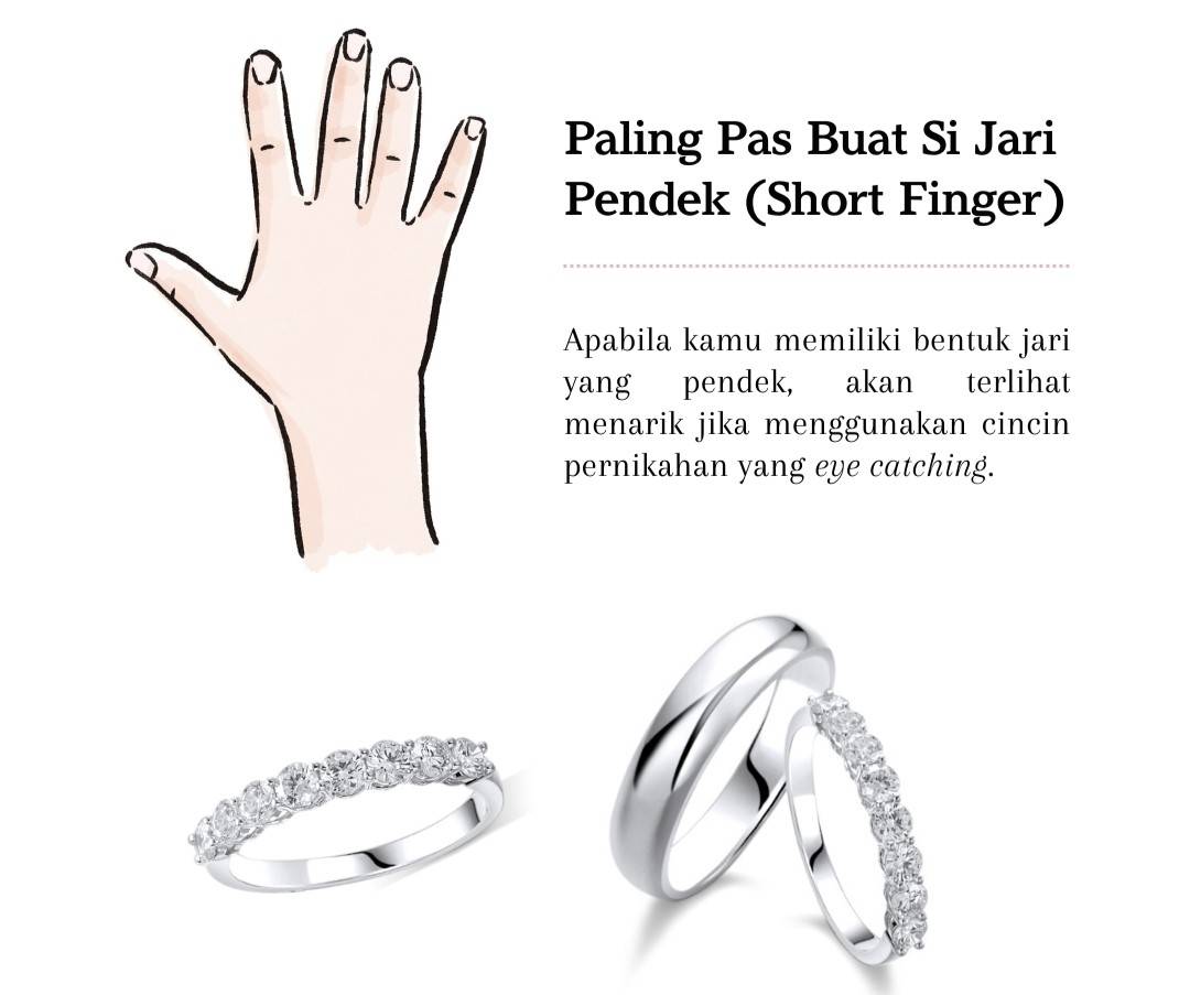 Tipe jari yang satu ini, dapat menjadi daya tarik tersendiri jika kamu memilih dengan detail yang kontras dan eye-catching. Cincin dengan desain yang unik dan menonjol seperti bentuk yang melengkung atau kombinasi logam yang berbeda dapat membantu memperpanjang tampilan jari kamu.
