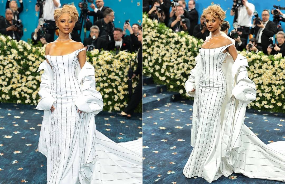 Mendapatkan inspirasi gaunnya dari Andre Leon Talley, seorang jurnalis kulit hitam di Amerika Serikat, penyanyi Tyla mengenakan white blue striped gown dari Jacquemus. Attire ini semakin menawan dengan makeup ala vintage Hollywood glam dengan riasan mata yang smokey. Tak hanya soal busana, tapi keseluruhan looks ini bisa kamu jadikan referensi untuk tampilan pernikahan yang lebih modern dan berani.