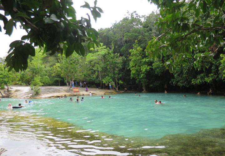 Emerald Pool atau kolam berwarna hijau batu jade terletak tidak jauh dari Pantai Ao Nang. Kolam ini dipercaya dapat membawa berkat bagi siapa saja yang berendam di sini. Namun, untuk menuju kolam pemandian ini tidak mudah.Tamu yang berkunjung harus berjalan melewati belantara hutan paling cepat duapuluh menit lamanya, karena letak kolam ini yang berada di tengah-tengah hutan belantara. Setelah menyaksikan sendiri, kolam tersebut memang berwarna hijau batu giok atau jade dan banyak orang berendam di dalamnya mencoba untuk mempercayai berkat yang akan mereka dapatkan.