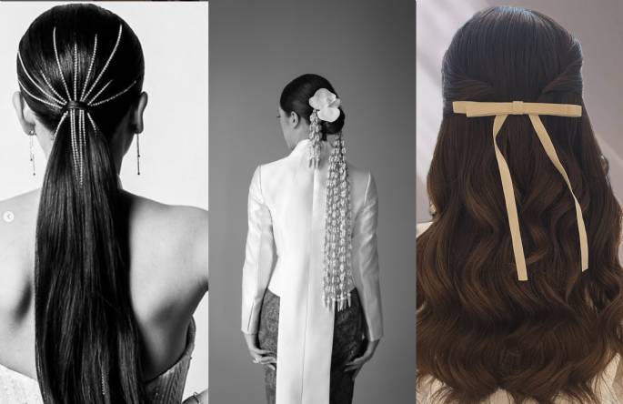 Kalau dulu tiara atau veil adalah satu-satunya pelengkap gaya rambut pengantin, tahun 2026 jadi eranya statement hair accessories. Dari pita beludru besar, jepit mutiara tebal, rantai rambut, sampai headpiece bunga metalik, semua jadi fokus utama yang bisa memperkuat gaya kamu.