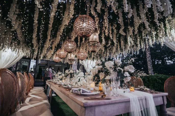 Kombinasikan pencahayaan pada dekorasi pesta pernikahan Anda untuk menambah kesan tertentu. Misalnya hanging glass dengan lilin elektronik di dalamnya untuk memberi kesan romantis dan magis di area makan malam. Di sisi lain, Anda dapat mengkombinasikan chandelier dengan langit-langit yang penuh terdekorasi dengan bunga dan rainy fairy lights untuk pesta dengan intimate dinner ataupun sebagai titik fokus di area makan malam pesta Anda. Unsur kain akan menambah kesan mewah di pesta Anda.