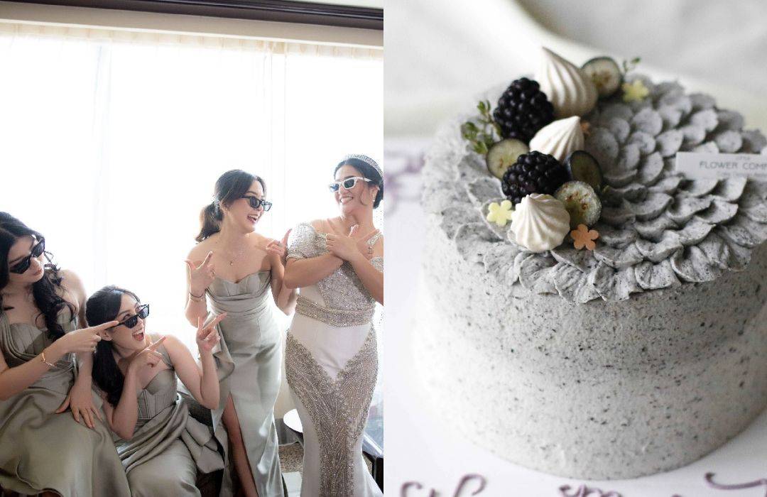 Tampilan elegan dan lembut dari gaun bridesmaid berwarna earl grey menciptakan atmosfer romantis. Dipasangkan dengan kue hojicha yang memiliki nuansa kombinasi abu dan coklat tua, kombinasi ini membawa kedamaian dan kehangatan. Filosofi warna earl grey mencerminkan bridesmaid yang anggun dan tenang, menambah sentuhan kelembutan pada perayaan.