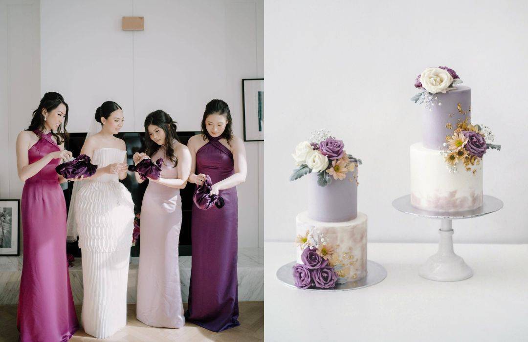 Kombinasi gaun bridesmaid purple fusion yang eksentrik dengan kue buttery lilac menciptakan pemandangan yang memesona dan bersemangat. Warna ungu yang kuat pada gaun bridesmaid melambangkan kreativitas, sementara warna lilac pada kue menambah sentuhan kelembutan. Filosofi warna purple fusion mencerminkan bridesmaid yang penuh keberanian dan inovatif, siap memberikan kejutan dalam momen istimewa. Warna ungu adalah simbol dari keberanian dan kreativitas. Gaun bridesmaid purple fusion menciptakan tampilan yang penuh semangat dan dinamis. Bridesmaid seperti purple fusion adalah sosok yang berani, kreatif, dan selalu mencari cara baru untuk membuat momen pernikahan lebih istimewa.