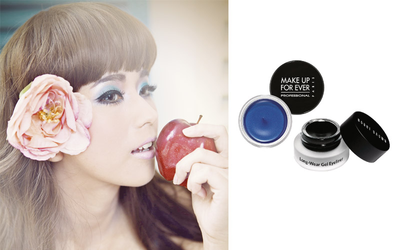 Pilihan eyeshadow biru terang dengan eyeliner cat wing memberi efek mata yang lebih besar.