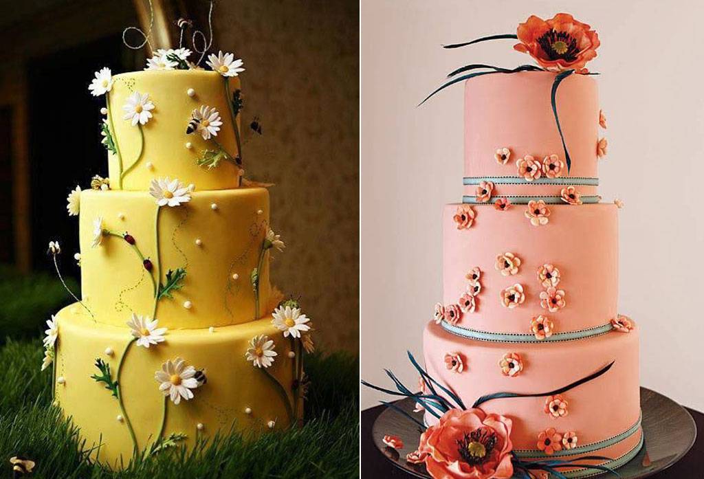 Merasa permukaan datar sudah biasa, hadir permukaan kue pengantin dari detail 3D yang muncul dari motif dekoratif. Dari kue yang terlihat di atas contohnya, kue dengan permukaan warna kuning yang ditumbuhi bunga-bunga yang timbul pada setiap layer. Di sampingnya tanpa ada tangkai, taburan kelopak bunga peach yang bertabur dalam bentuk 3D terlihat menarik dan simple.