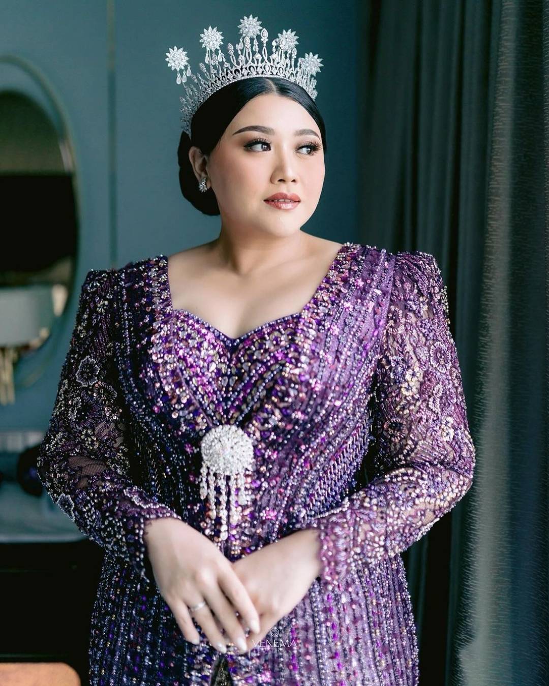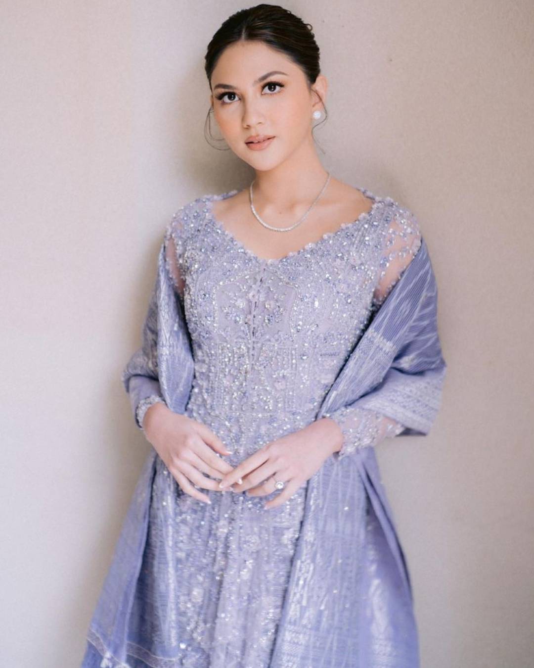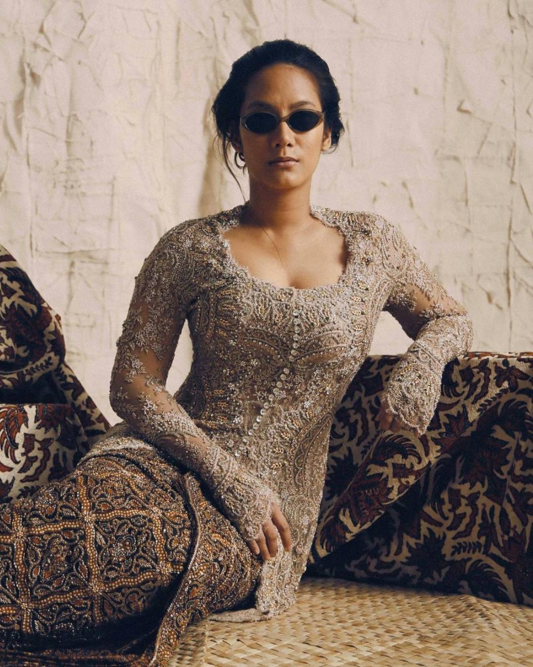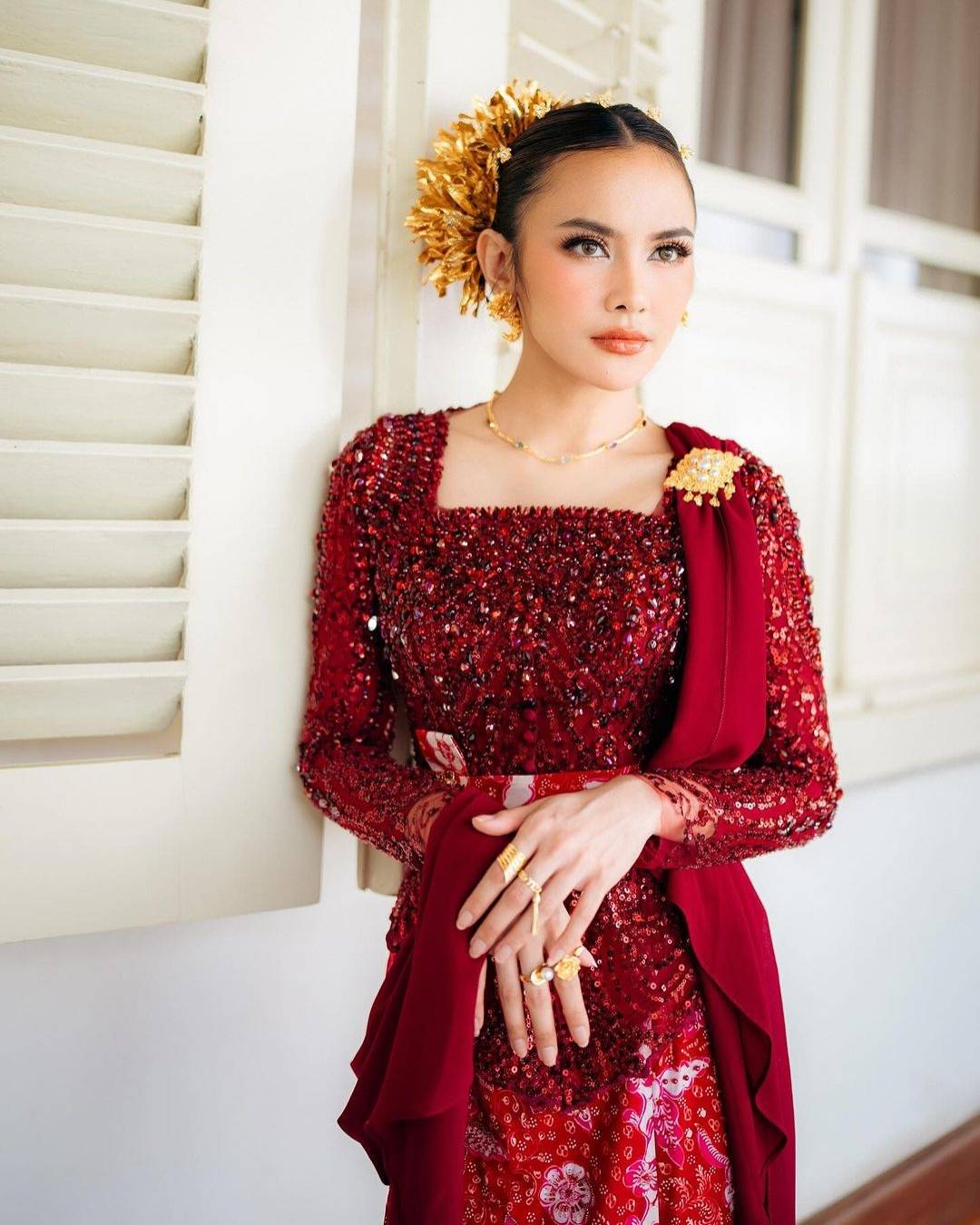 Kebaya dengan tipe kerah kotak sangat efektif dalam menyamarkan kesan bahu yang terlalu lebar. Desain kerah yang tegas akan mengalihkan perhatian dari garis bahu dan menciptakan tampilan yang lebih seimbang.