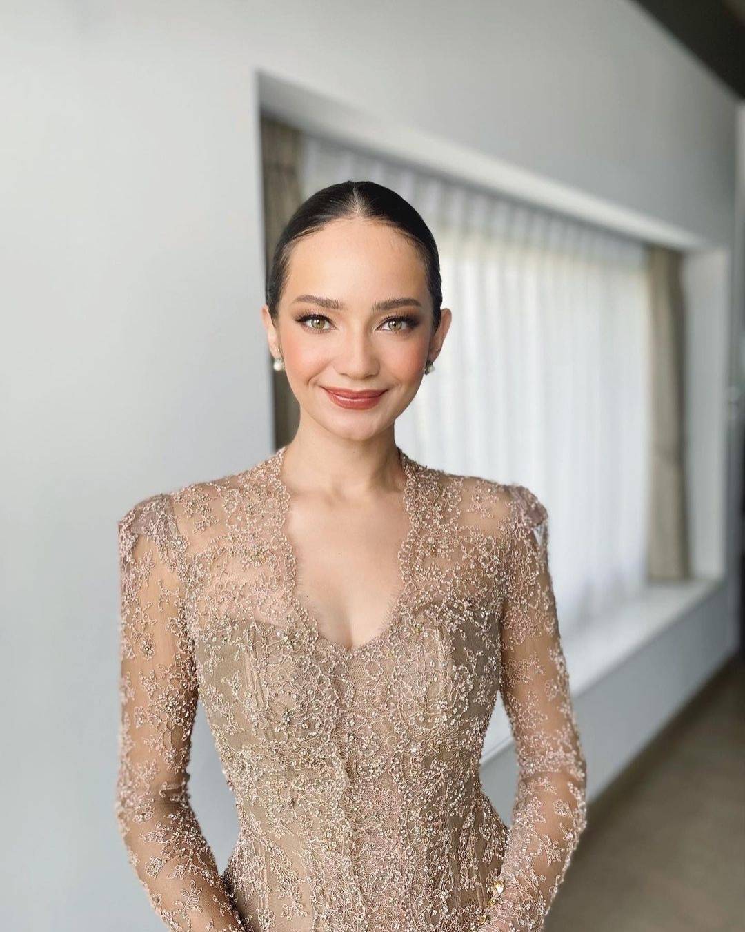 Aksen renda pada kebaya yang menyerupai bentuk halter ini dapat memberikan kesan proporsional pada siapapun yang ingin menutupi leher yang terlalu jenjang namun tetap menampakan bagian bahu yang indah.