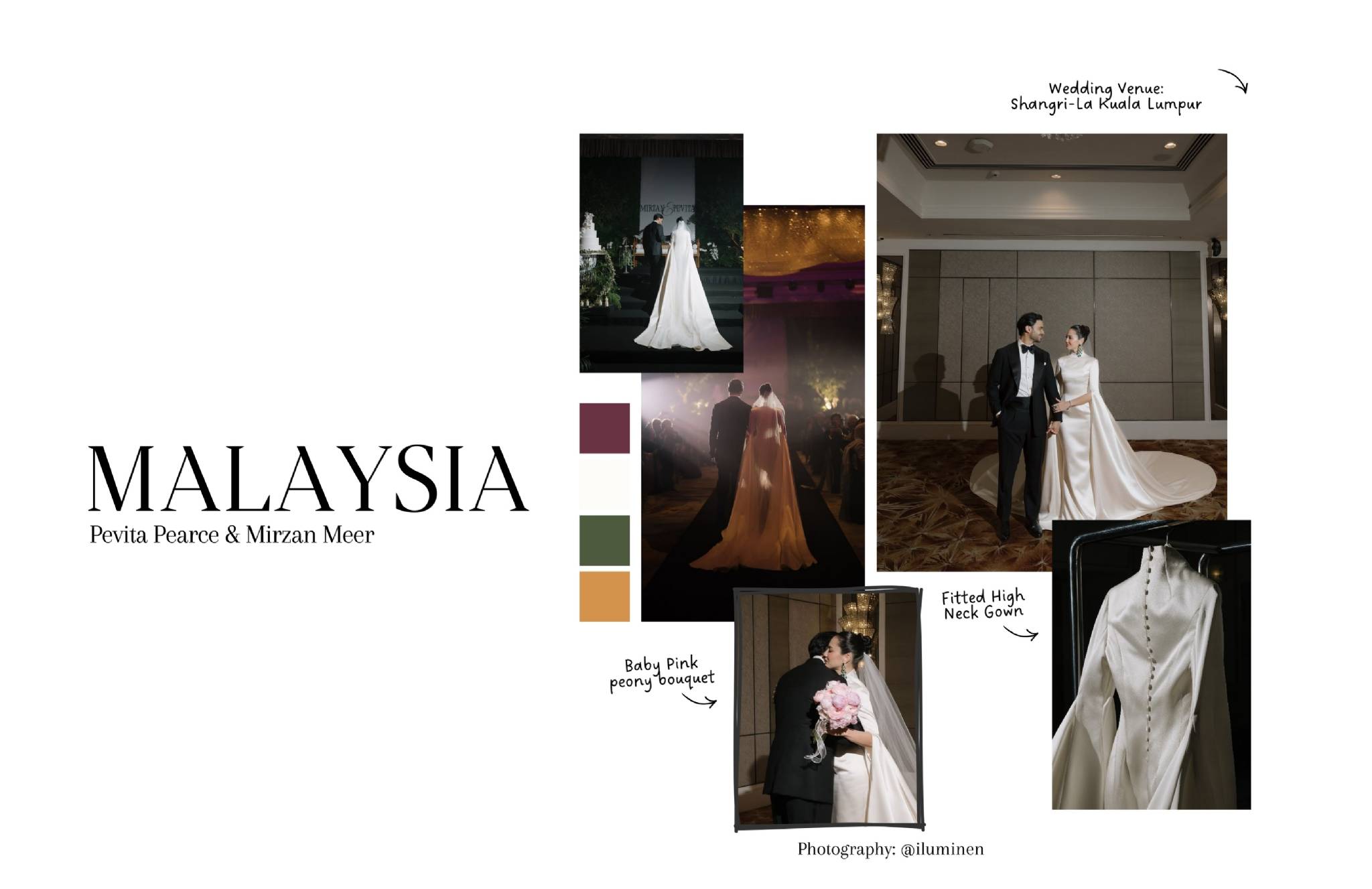 Modern, elegant and sophisticated, inilah kesan pernikahan Pevita Pearce dan Mirzan Meer yang dilangsungkan di Shangri-La Kuala Lumpur. Venue hotel bintang lima ini menawarkan kemewahan yang tidak berlebihan, cocok untuk pasangan yang menginginkan pernikahan berkelas dengan sentuhan minimalis modern. Pevita memilih fitted high neck gown yang memberikan penampilan classy dan powerful, sementara baby pink peony bouquet menghadirkan nuansa lembut dan romantis. Pernikahan ini menunjukkan bahwa destination wedding tidak melulu harus outdoor atau penuh eksplorasi alam, tetapi urban luxury pun bisa terasa sangat personal.