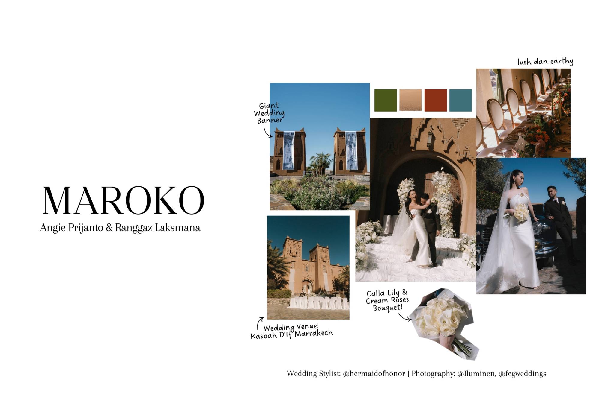 Menikah di Marrakech menghadirkan atmosfer yang sangat berbeda dari kebanyakan destination wedding lainnya. Ranggaz Laksmana dan Anggie Prijanto memilih Kasbah D’if sebagai latar pernikahan mereka, menciptakan suasana lush dan earthy yang begitu kuat. Nuansa warna tanah, hijau alami, serta tekstur khas arsitektur Maroko menyatu indah dengan dataran dan bangunan di sekitarnya. Salah satu elemen yang paling mencuri perhatian adalah giant wedding banner yang menjadi statement visual sekaligus simbol perayaan cinta mereka. Dipadukan dengan bouquet Calla Lily dan cream roses, keseluruhan konsep terasa hangat, intim, dan sarat karakter. Pernikahan ini membuktikan bahwa Maroko bukan hanya eksotis, tapi juga mampu menghadirkan wedding aesthetic yang elegan dan soulful.