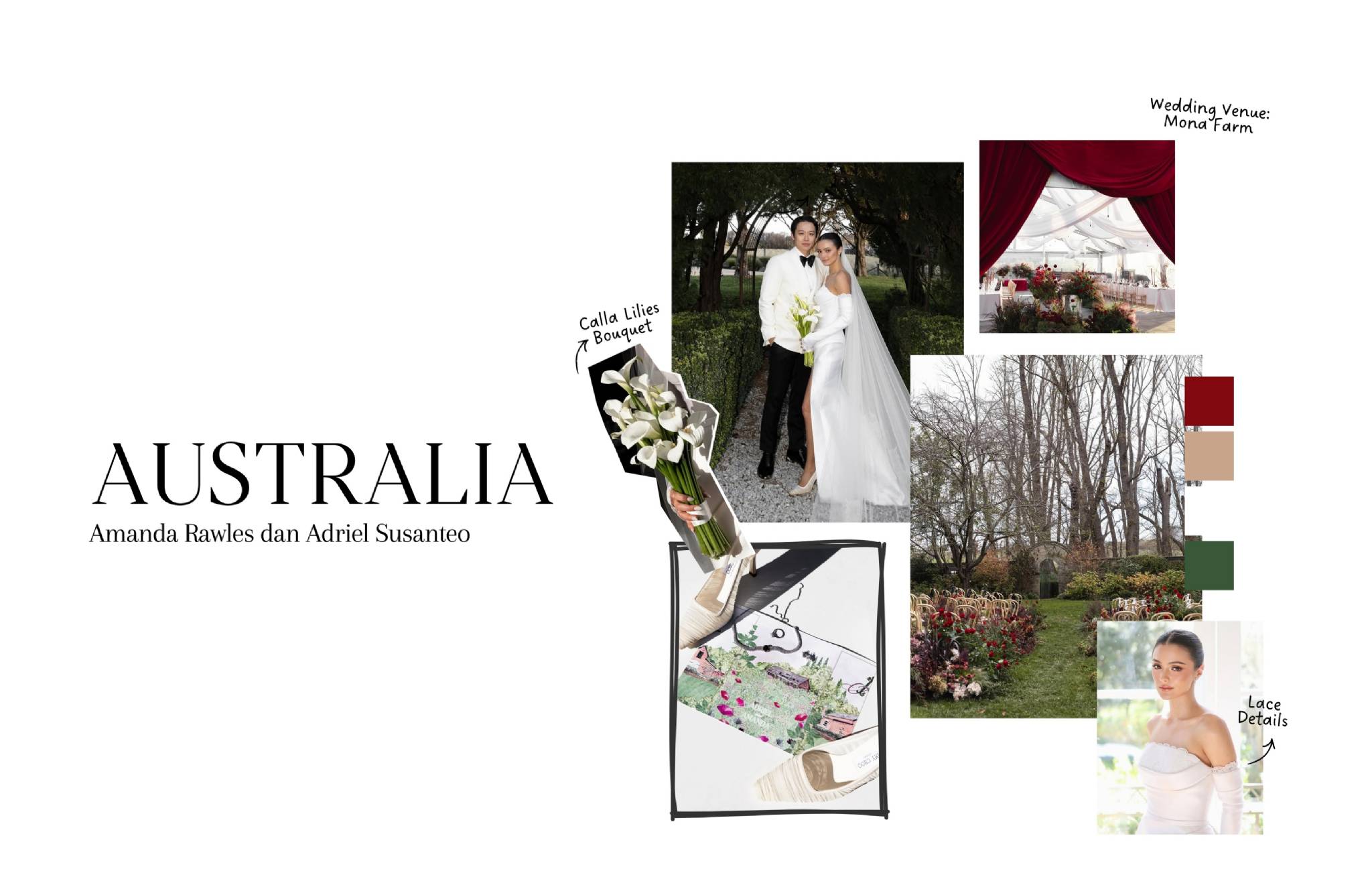 Berpindah ke Australia, Amanda Rawles dan Adriel Susanteo memilih Mona Farm sebagai tempat mereka mengikat janji suci. Venue ini dikenal dengan alamnya yang luas, hijau, dan tranquil, sempurna untuk pasangan yang menginginkan pernikahan intimate dengan sentuhan countryside tapi tetap memiliki kesan nuansa luxury. Gaun dengan lace details yang dikenakan Amanda menyatu harmonis dengan lingkungan sekitar, menciptakan kesan effortless elegance. Bouquet Calla lilies melengkapi keseluruhan looknya dengan kesederhanaan yang modern. Pernikahan ini terasa hangat, personal, dan sangat cinematic, menjadi sebuah bukti keindahan alam bisa menjadi dekorasi terbaik.