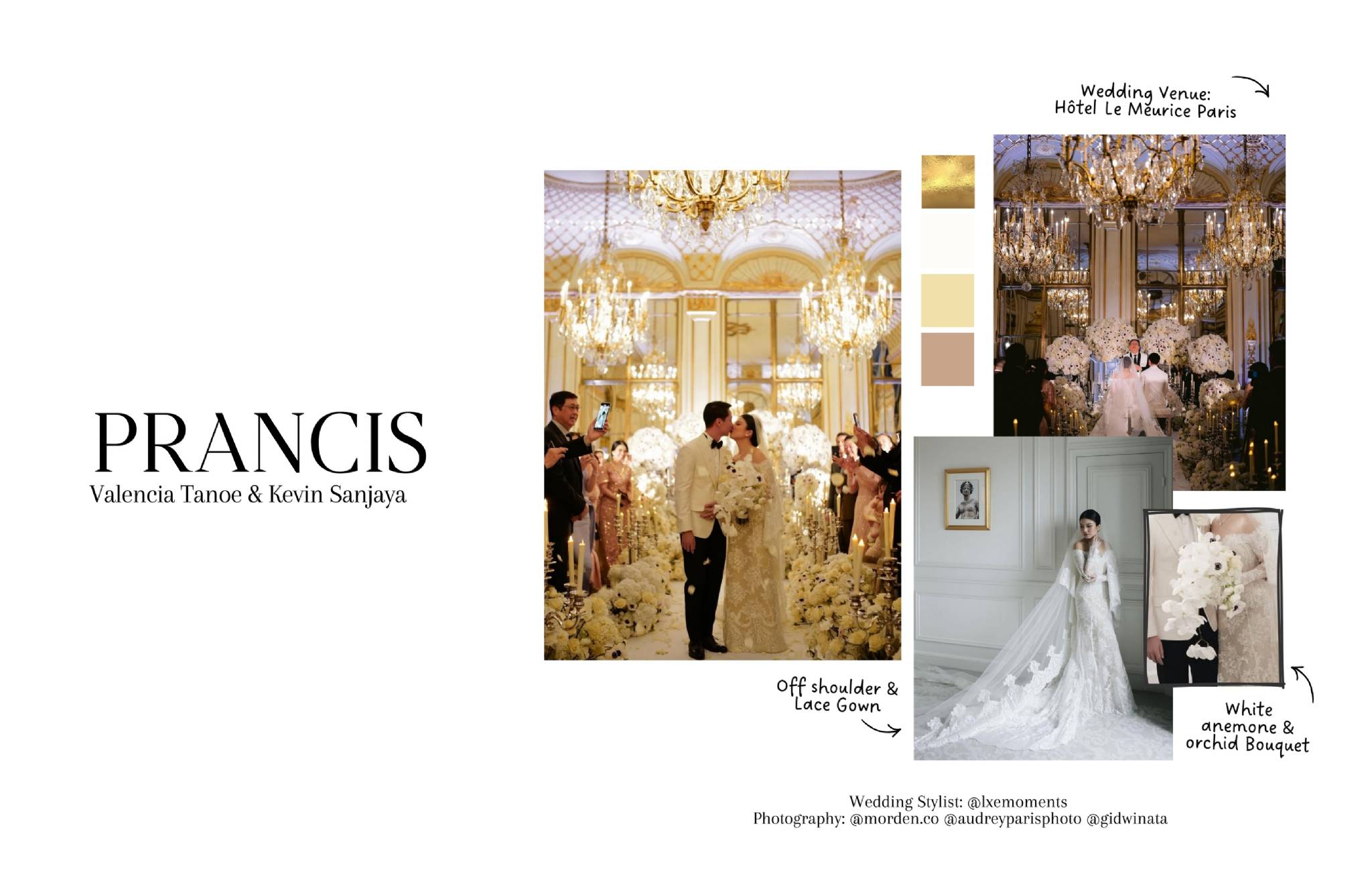 Kota Paris memang selalu identik dengan cinta, dan Valencia Tanoe serta Kevin Sanjaya pun memilih untuk merayakan pernikahan mereka di kota ini dengan sentuhan klasik yang begitu refined. Hotel Le Meurice, dengan interior mewah dan sejarah panjangnya, menjadi latar sempurna untuk pernikahan pasangan ini yang timeless. Valencia tampil anggun dalam off-shoulder lace gown yang memancarkan kesan feminin dan romantis. Pilihan white anemone orchid bouquet juga semakin menegaskan nuansa elegan dan sophisticated. Pernikahan ini menunjukkan bahwa Paris tidak perlu banyak eksplorasi visual, keindahannya sudah berbicara dengan sendirinya.