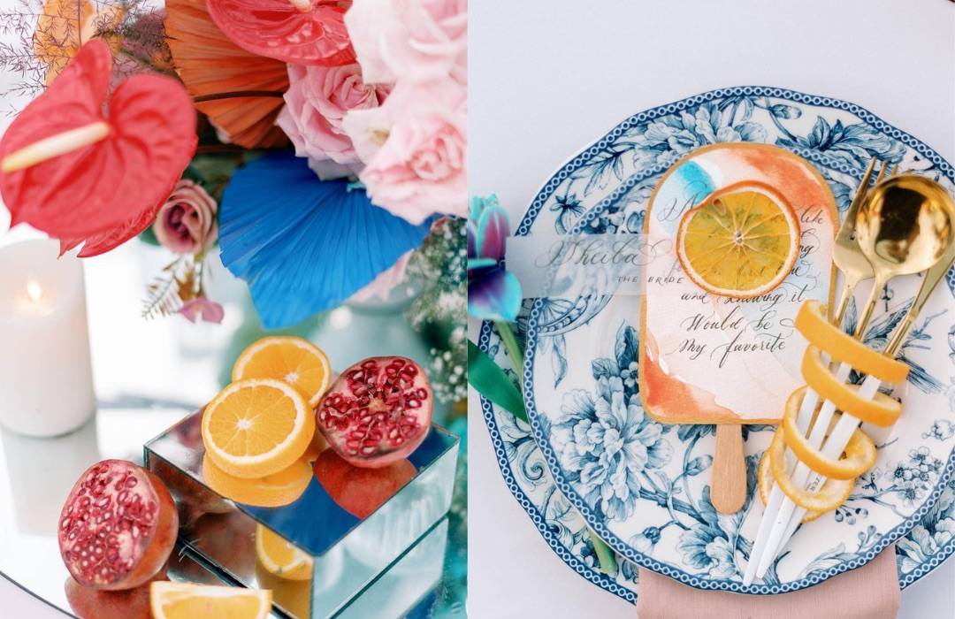 Buah lainnya yang memiliki warna cerah adalah jeruk dan pomegranate atau delima merah. Penempatan potongan-potongan buah ini membuat suasana wedding-mu seperti surga tropis. Tak hanya itu, kulit jeruk bisa juga digunakan untuk mempercantik cutlery-mu dengan dikupas secara spiral dan digunakan sebagai hiasan untuk menyatukan sendok dan garpu.