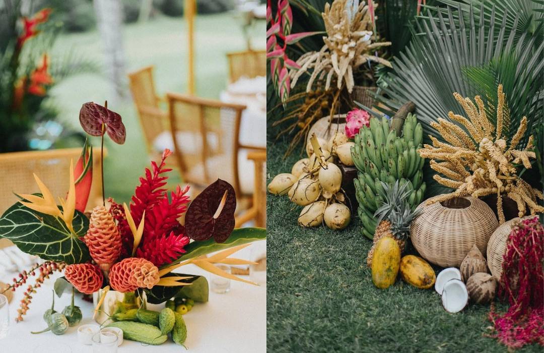 Semakin kreatif, bukan hanya buah-buahan yang sering dijumpai di supermarket, tapi kamu juga bisa menggunakan tumbuhan unik seperti bitter ginger. Bitter ginger adalah tumbuhan yang tumbuh di tanah benua Asia. Kamu juga kombinasikan dengan buah-buahan tropis lainnya kelapa, pisang, serta pepaya. Semakin natural apabila kamu menggelar pernikahan dengan venue yang dilengkapi dengan setting rumput yang hijau.