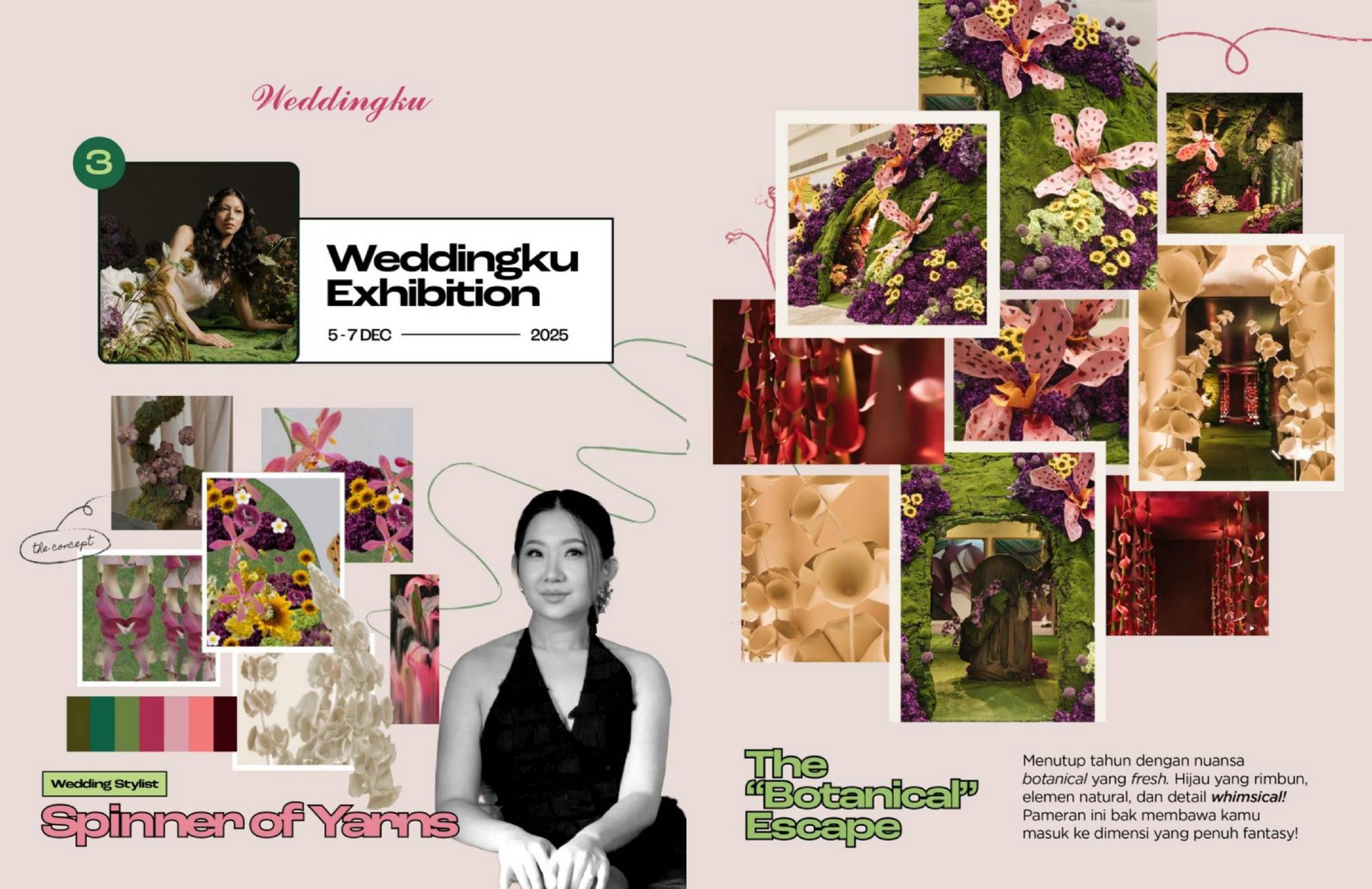 Menutup rangkaian pameran tahun 2025,Weddingku Exhibition pada 5–7 Desember 2025 menghadirkan Flower Fantasy dalam versi yang lebih immersive lewat tangan Spinner of Yarns. Mengusung tema “The Botanical Escape,” pameran ini membawa pengunjung masuk ke dunia botanical yang segar dan penuh detail. Dominasi elemen hijau, dedaunan rimbun, serta sentuhan natural berpadu dengan detail whimsical, menciptakan suasana seolah berada di dimensi lain yang jauh dari hiruk pikuk kota.