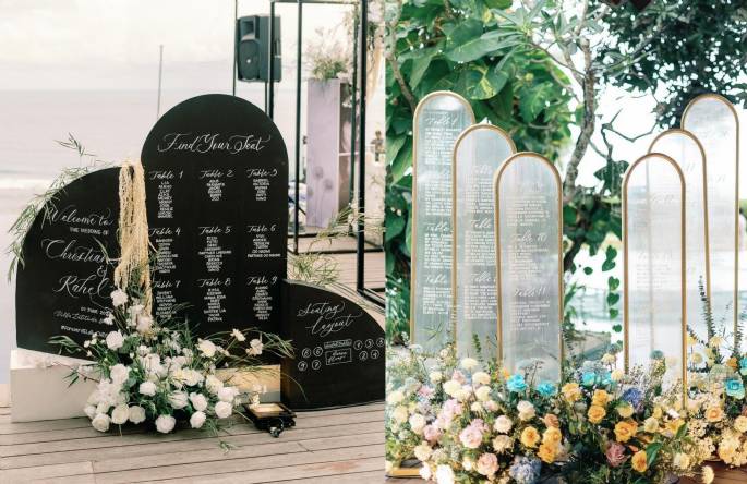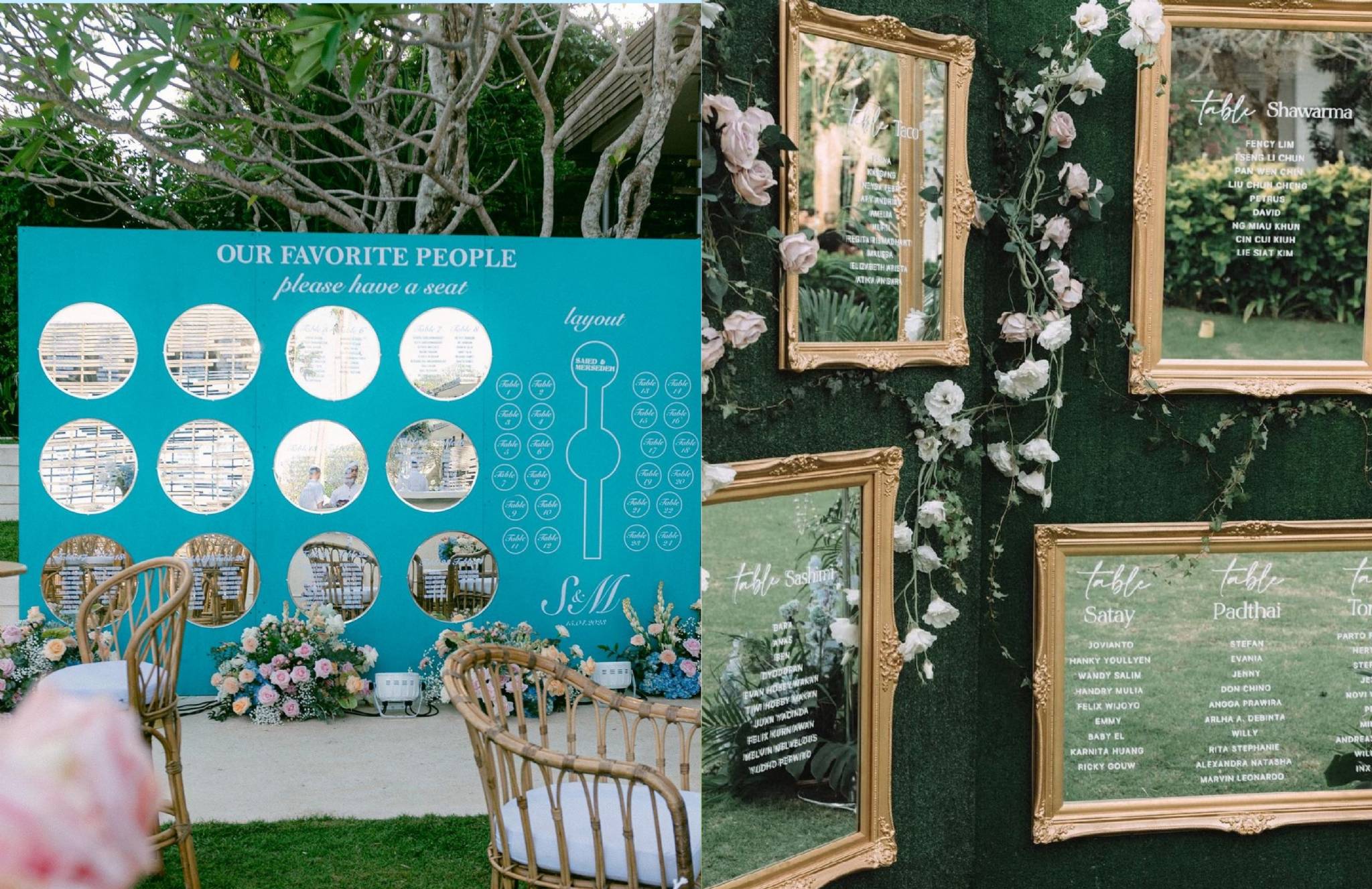 Untuk wedding di taman atau kebun, seating chart dengan sentuhan floral, elemen kayu, atau acrylic transparan bisa jadi pilihan. Formatnya bisa berupa papan besar dengan daftar nama dan nomor meja yang tersusun rapi. Simpel, elegan, dan tetap romantis.