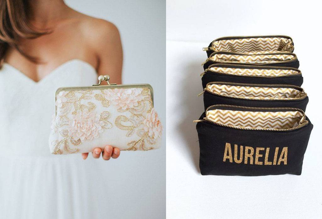 Tempat serbaguna seperti pouch dapat dipakai untuk menaruh kosmetik. Bridesmaid pasti tidak akan keberatan menerima pouch dari bahan faux leather yang tampak tidak murahan. Pilihan lain adalah clutch yang dapat dibawa ke pesta atau acara formal lainnya.