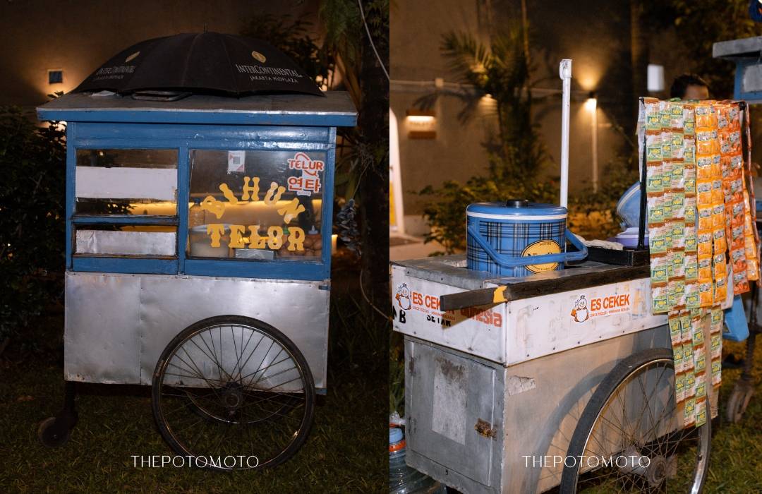 Tema pasar malam juga terasa dalam pilihan snack saat acara. Para tamu bisa menikmati jajanan khas lokal yang membangkitkan kenangan masa kecil, seperti Susu Murni Nasional, kue cubit, hingga es cekek. Tak ketinggalan, gerobak-gerobak jajanan pun dihias dengan desain yang senada, makin menambah suasana meriah. Tak hanya itu, katering tradisional seperti Empal Gentong hingga kambing guling pun ditulis dengan judul yang kocak yang pastinya bikin kenyang dan menghibur tamu undangan.
