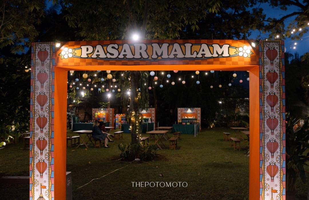Resepsi yang mengusung konsep “Pasar Malam” di venue yang diberi nama Kabupaten Sukahati dan digelar secara outdoor ini dipenuhi dengan detail yang sangat unik. Setiap sudutnya dihiasi dengan desain bergaya retro-pop-art khas Indonesia tahun 1980-an, lengkap dengan poster-poster berwarna bold yang terang dan ceria, menciptakan suasana yang hangat dan penuh nostalgia. Mulai dari tiket masuk hingga denah pasar malam, semuanya didesain sekreatif mungkin untuk mereplika sesuai pasar malam lokal yang ada.