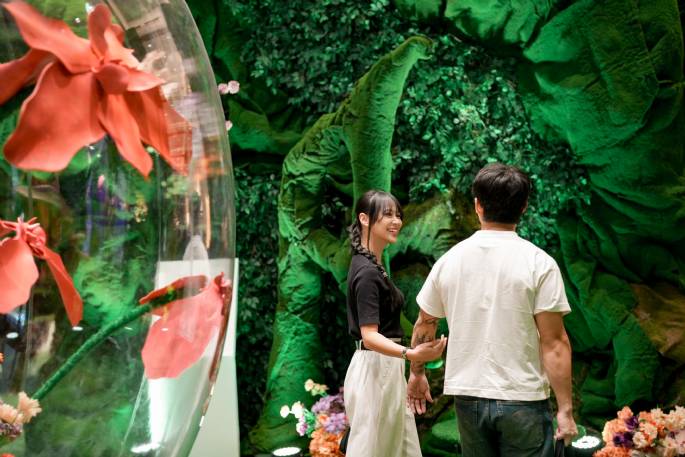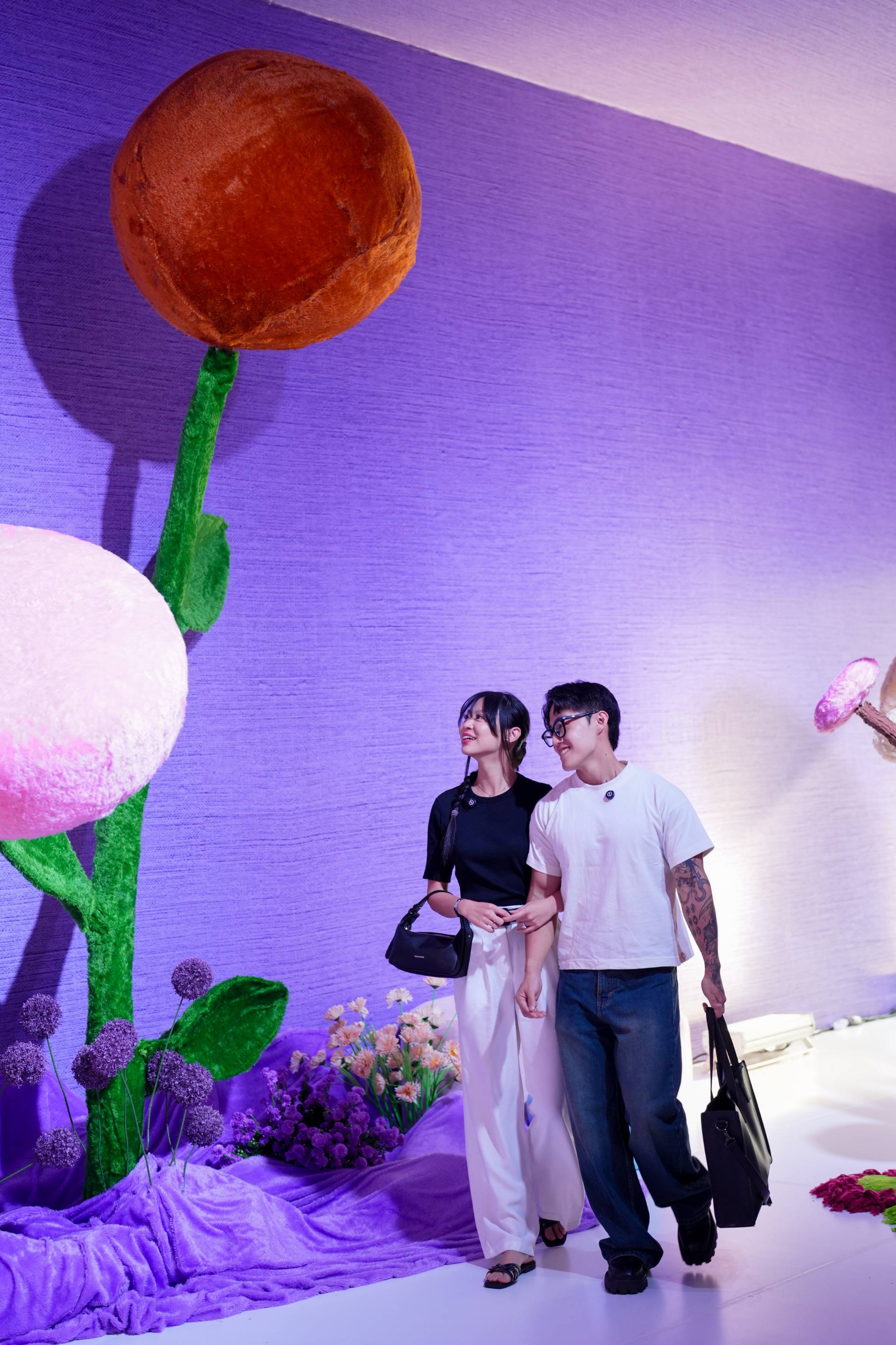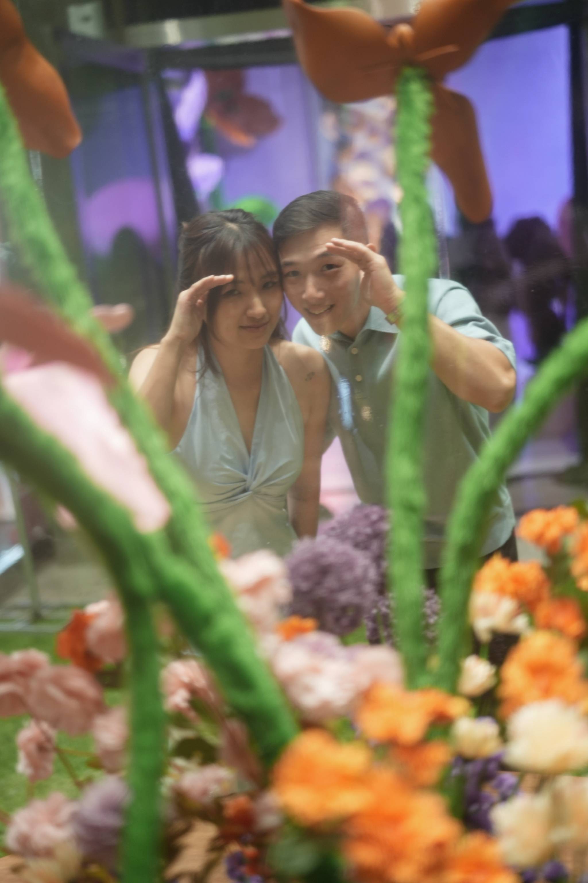 Instalasi ini terbagi dalam tiga nuansa yang berbeda. Setelah calon pengantin meng-scan entrance di pintu masuk, mereka akan disambut dengan instalasi yang didominasi warna ungu yang diberi judul “The Playground”. “The Playground” ini memvisualisasikan vibe alam mimpi yang whimsical dengan elemen bunga-bunga tinggi menjulang dengan tekstur yang plush, ayunan dari rerumputan hijau, dan cushy grounds yang membuat setiap orang yang berjalan merasa tenang namun senang. Ruangan ini menuangkan rasa penasaran dan imajinasi yang tak terbatas, mengajakmu untuk bermain, merasa, dan menjelajahi nuansa ini secara bebas.