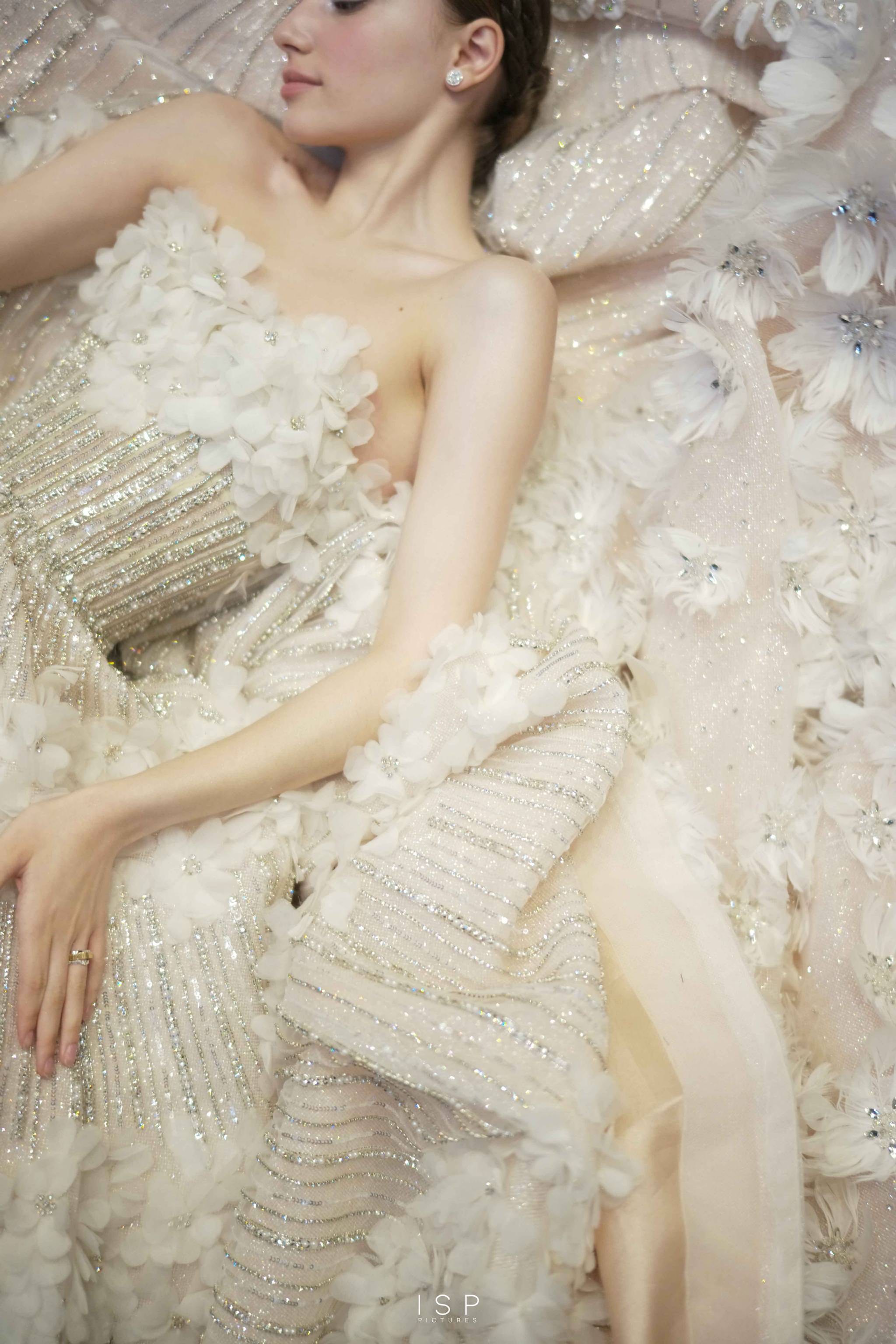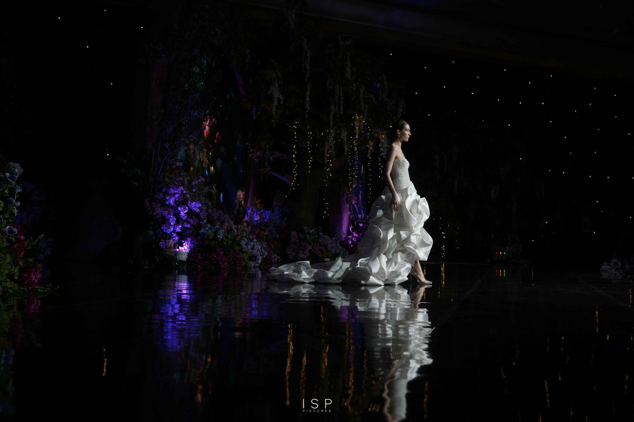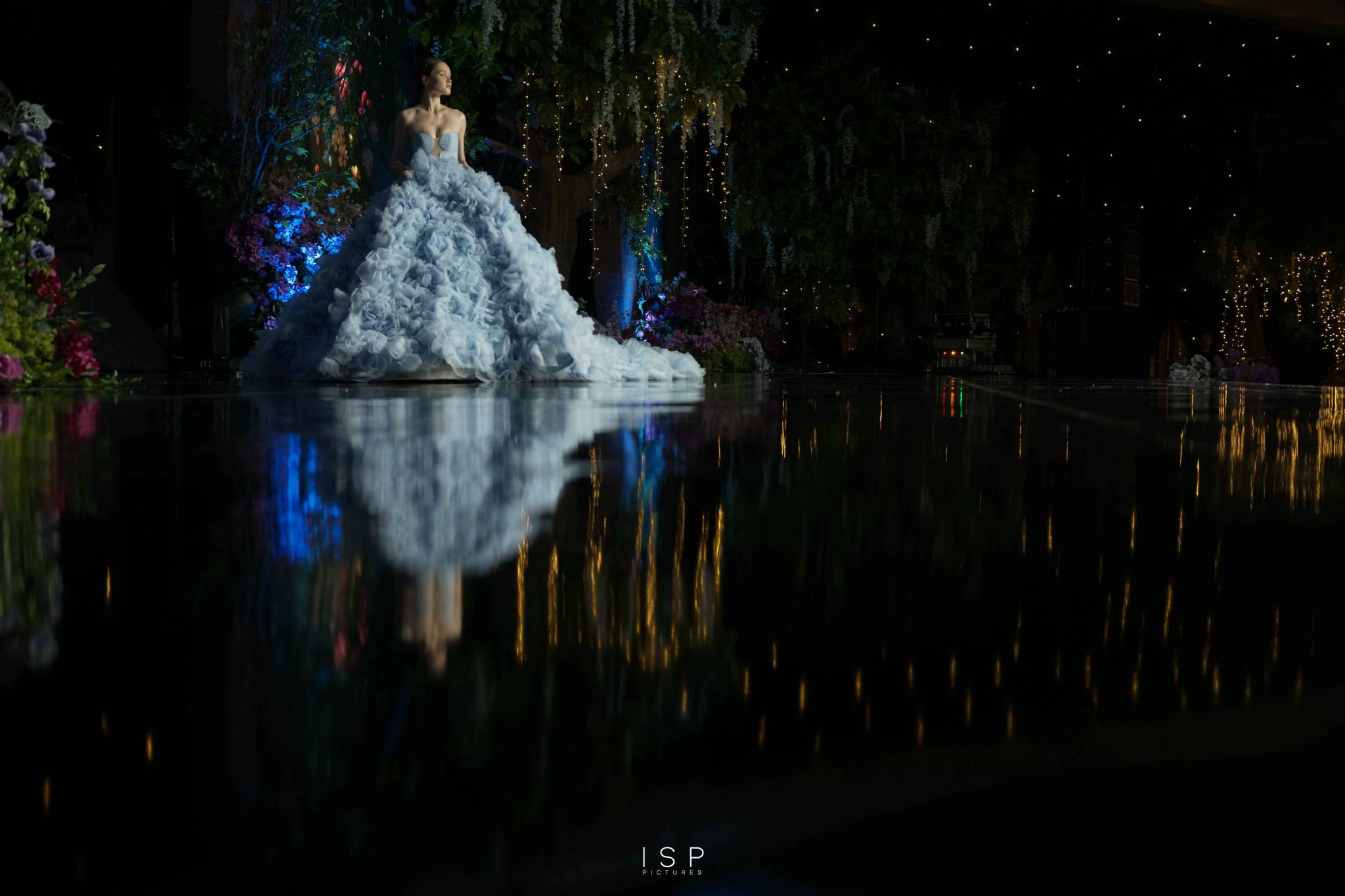 Monica Ivena yang hasil karyanya yang telah dikenakan artis luar negeri seperti Khloe Kardashian dan Taylor Swift ini, mempertunjukkan white glitter wedding ball gown, tulle dress dengan warna biru dan ungu pastel yang cantik, feather wedding ball gown yang semua koleksinya memiliki aksen bunga yang kuat.