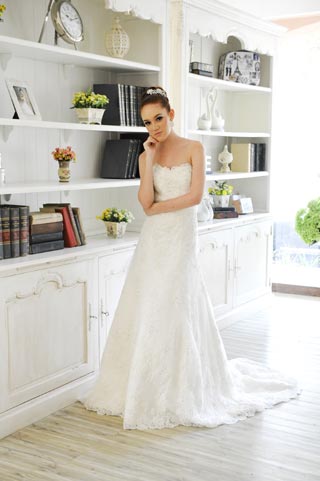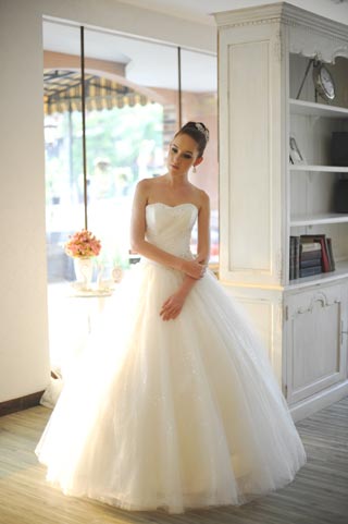 Gaun pengantin bentuk A-line model straples berhiaskan butiran-butiran swarovsky di bagian dadanya. Gaun dengan ‘chapel train’ banyak diminati calon pengantin karena relatif mudah diatur ketika berjalan menuju altar atau pelaminan.