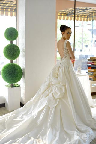 Tiada yang lebih berkesan dibandingkan menyaksikan seorang mempelai berjalan menyusuri altar dengan menggunakan gaun pengantin dengan train bermodel ‘cathedral’. Tampil lebih seksi dengan backless perhatian pun langsung tertuju pada train dengan aksen pita besar di bagian puncaknya.