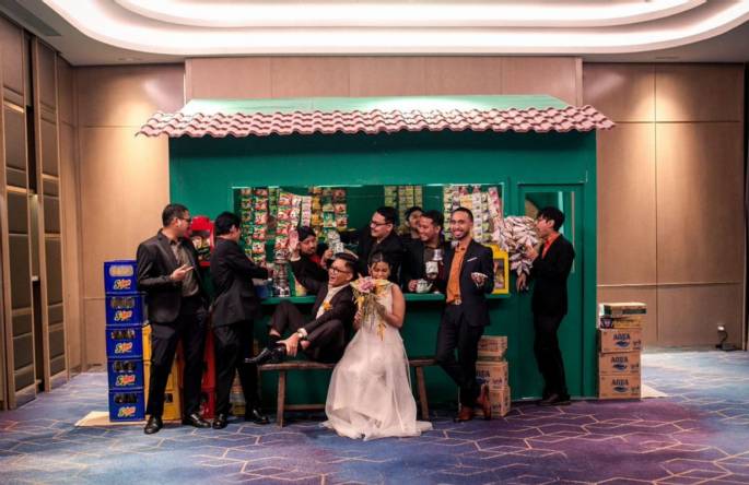 Konsep ini mengambil inspirasi dari elemen warung kaki lima (Tendaan Nasi Uduk Pecel Lele) yang sangat dekat dengan keseharian masyarakat Indonesia. Alih-alih menampilkan dekor mewah yang terasa jauh dari kehidupan sehari-hari, pasangan memilih menghadirkan suasana yang membumi, akrab, dan penuh kenangan. Namun tentu saja, ini bukan warung dalam arti literal. Semua elemen dikurasi ulang, spanduk dengan tipografi khas warung diganti dengan nama pasangan dan tanggal pernikahan, krat botol minuman disusun rapi menjadi instalasi dekor yang artsy, dan yang paling menariknya adalah rencengan minuman sachet dihadirkan sebagai statement visual yang unik dan Instagramable. Hasilnya? Sudah pasti menjadi pernikahan yang terasa lokal, autentik, tapi tetap sophisticated.