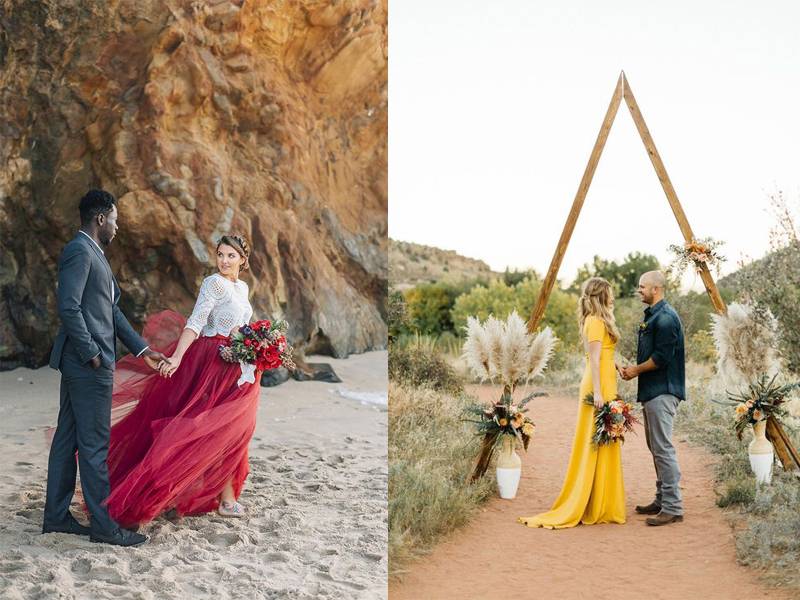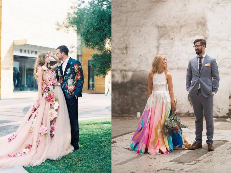 Jika masih ingin mengenakan warna dasar putih, Anda bisa menambahkan aksen colorful di bawah gaun. Bisa juga dengan mengenakan bunga berwarna-warni sebagai tiara dan hand bouquet agar kesan colorful masih terasa.