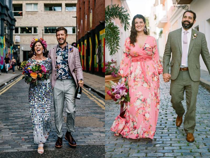 Jika Anda mengenakan gaun berwarna dasar abu-abu dan dengan motif bunga, Anda akan tampak feminin sekaligus terlihat calm. Jika Anda menggunakan warna dasar merah muda dengan motif bunga, Anda akan terlihat sangat girly dan feminin. Mengenakan gaun berwarna selain putih dengan motif seperti kaca juga ide yang sangat menarik karena aksen kaca yang ada di gaun tersebut mampu memantulkan setiap warna yang ada di sekitar Anda. Jadi, Anda juga akan terlihat sangat berwarna.