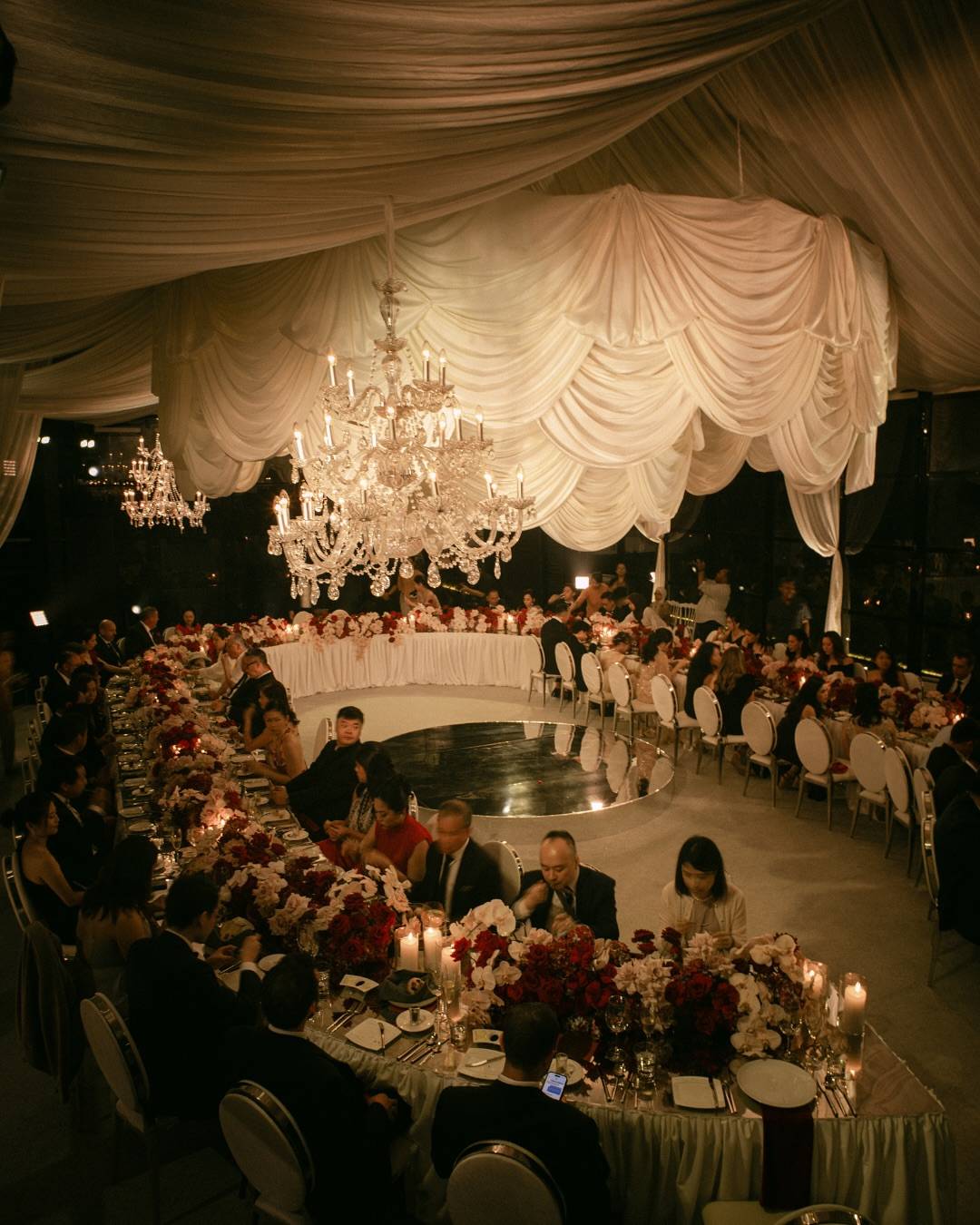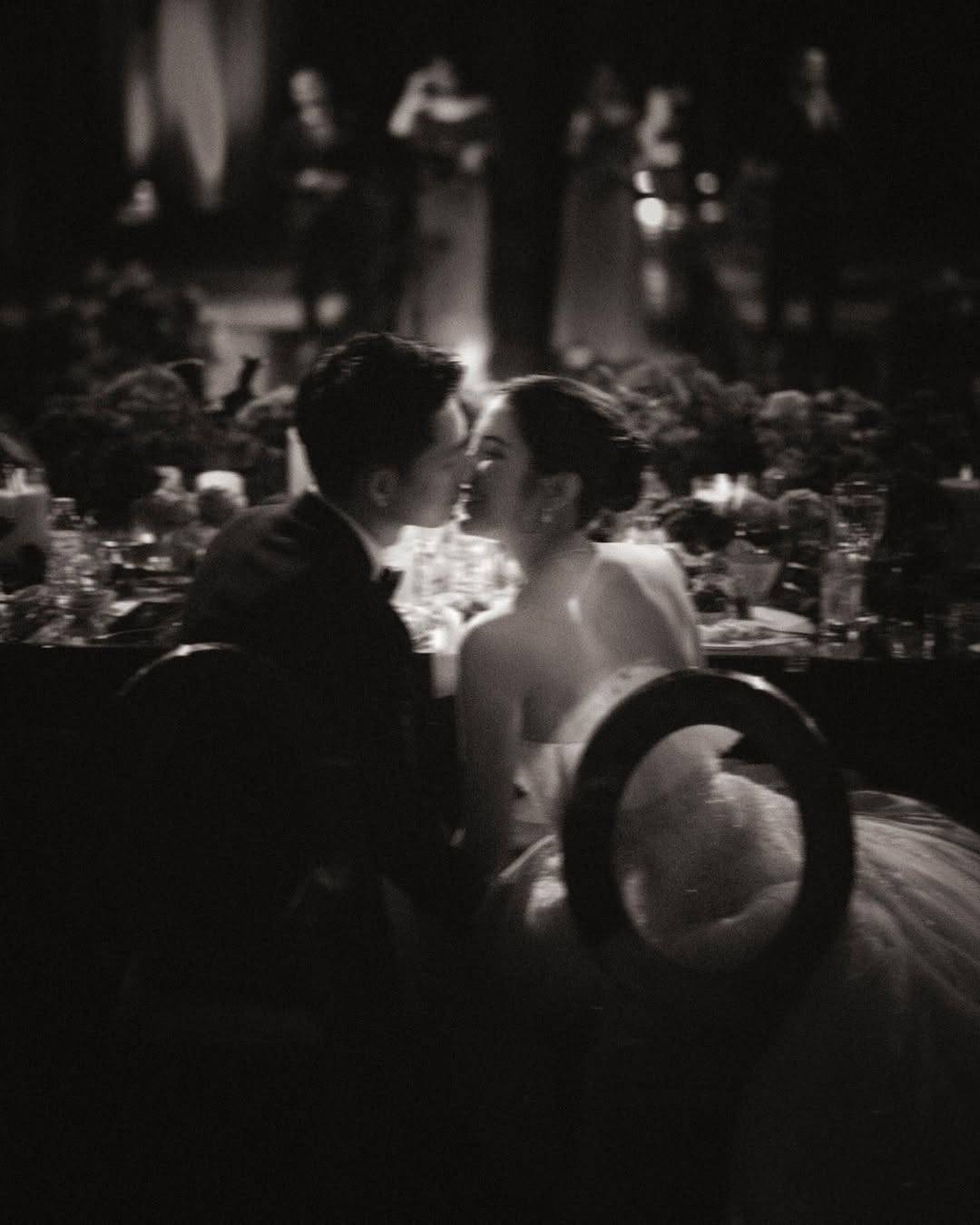 Setelah first dance dan cake cutting, maka tiba saatnya ke wedding dinner. Kini ada momen yang sedang on-trend, yaitu shoot dari belakang kedua kursi pengantin saat sajian makan malam di mana keduanya melakukan table kissing mesra. Posisi leaning in yang intimate menambah nuansa romantis pada hasil fotonya.