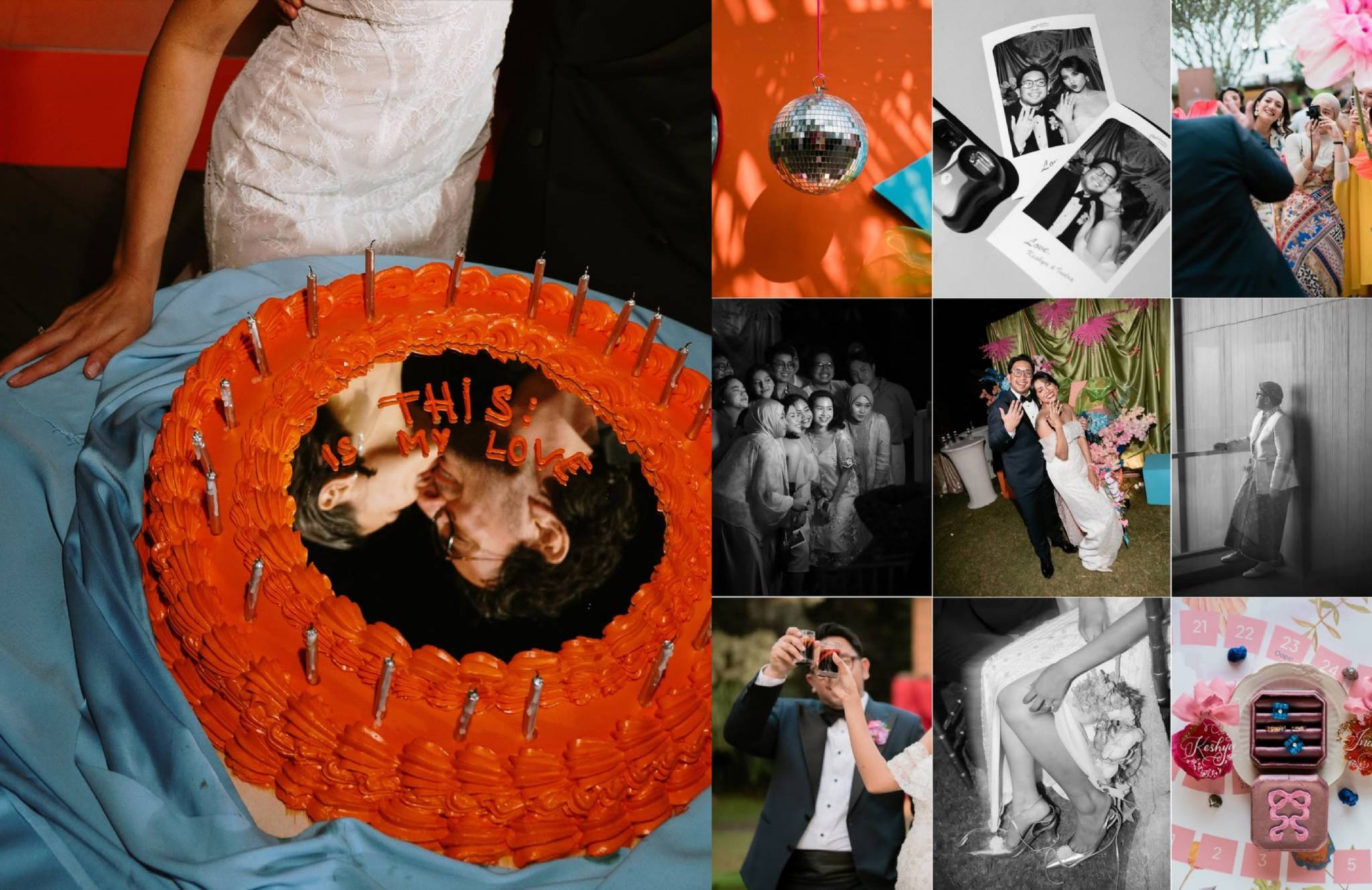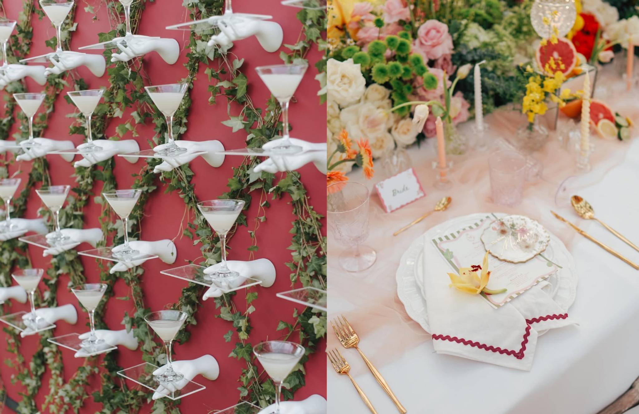 Salah satu ciri paling kuat dari kitschy wedding adalah perpaduan dua gaya yang cukup kontras, yaitu retro dan coquette. Elemen retro menghadirkan nuansa nostalgia, sentuhan 60s, 70s, atau 90s dengan tipografi klasik, pattern playful, hingga properti dekor yang terasa “jadul tapi keren”. Sementara gaya coquette membawa sisi romantis yang manis, feminin, dan sedikit dreamy. Bayangkan pita-pita lembut, lace detail, hingga siluet cake vintage yang klasik, dipadukan dengan warna dan elemen visual yang berani. Dan jangan salah, dari pihak groom pun tetap bisa stand out. Sentuhan funky seperti patterned suit, dasi warna kontras, atau aksesori unik bisa menjadi statement yang kuat tanpa terlihat tenggelam dalam palet warna pastel.