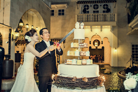Kue Pengantin – Untuk sebuah pesta pernikahan yang unik, hadir pula sebuah kue pengantin yang unik pula. Menyesuaikan denga tema pernikahan yang beratmosfer mediterania, Gordon Blue menghadirkan kreasi kue pengantin yang unik. Berbeda dengan kue pengantin yang lain, digunakan hiasan ranting sebagai aksen yang menyatukan kue pengantin dengan tema pesta secara keseluruhan. Tersusun pula potongan-potongan kue kecil di tengah-tengah kue pengantin berwarna putih. Di atasnya diberi hiasan dua penguin yang emnjadi simbol dari kedua mempelai ini.