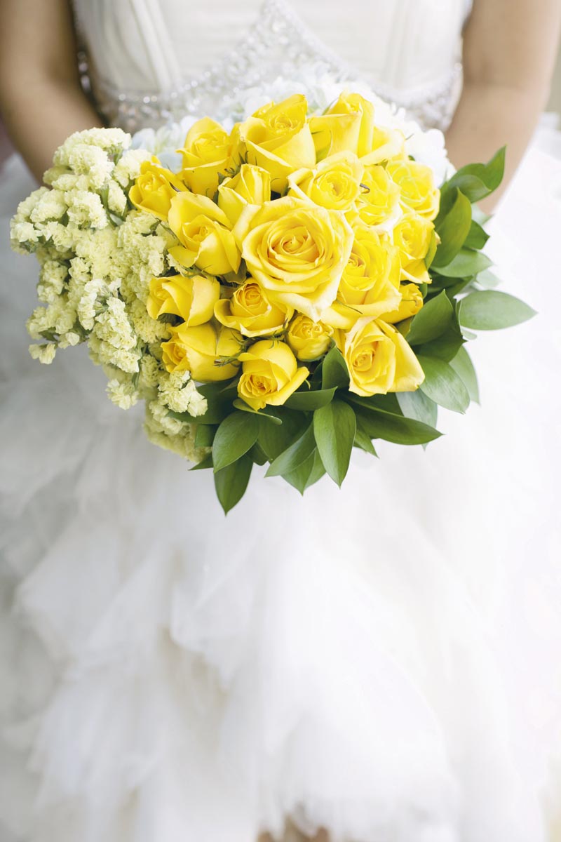 Perpaduan aneka bunga yang terdiri dari mawar kuning, statis kuning, hydrangea, dan daun ruscus membawa aura ceria ke dalam pesta pernikahan Anda.