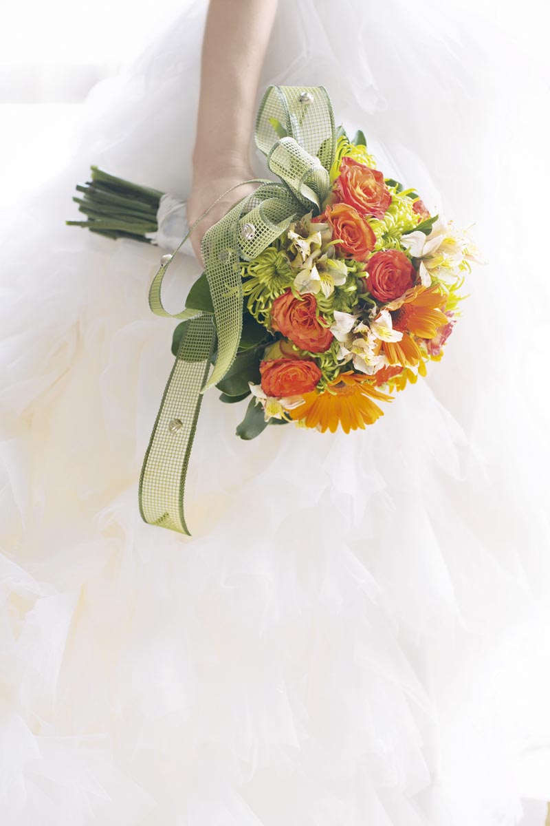Warna oranye melambangkan kekuatan, kehangatan, kegembiraan, persahabatan, dan kesehatan yang baik. Tentu saja kelima hal yang diwakili lewat rangkaian mawar oranye, alstroemeria, shamrock, garbera, dan daun schefflera ini menjadi harapan Anda berdua dalam mengarungi kehidupan berumah tangga.