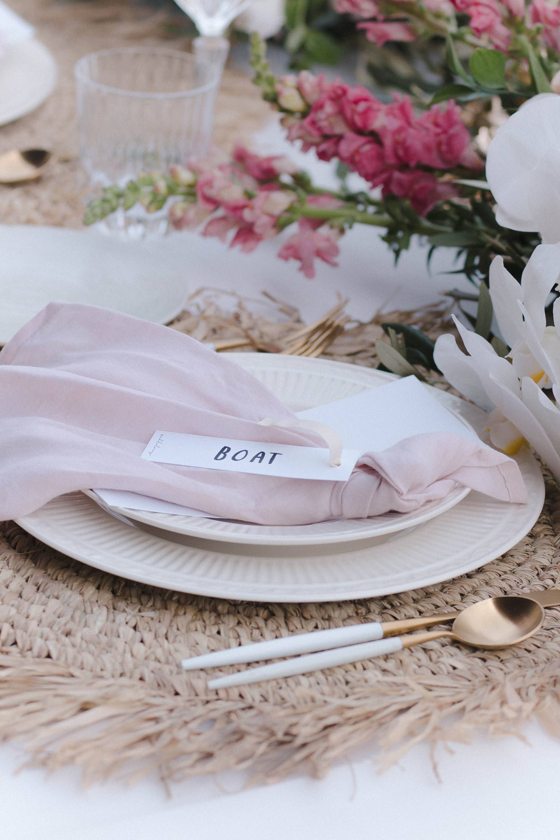 Placecard atau kartu sebagai penanda bagi tamu undangan dimana ia akan duduk di meja resepsi pesta pernikahan Anda menjadi elemen paling umum terutama di pesta berformat sitting dinner. Placecard nama ini biasanya ditulis sedemikian rupa dengan tulisan kaligrafi yang indah dan dihias dengan cantik. Salah satu ide menghias placecard ini adalah dengan silk ribbon sesuai dengan tema warna dari pesta pernikahan Anda.