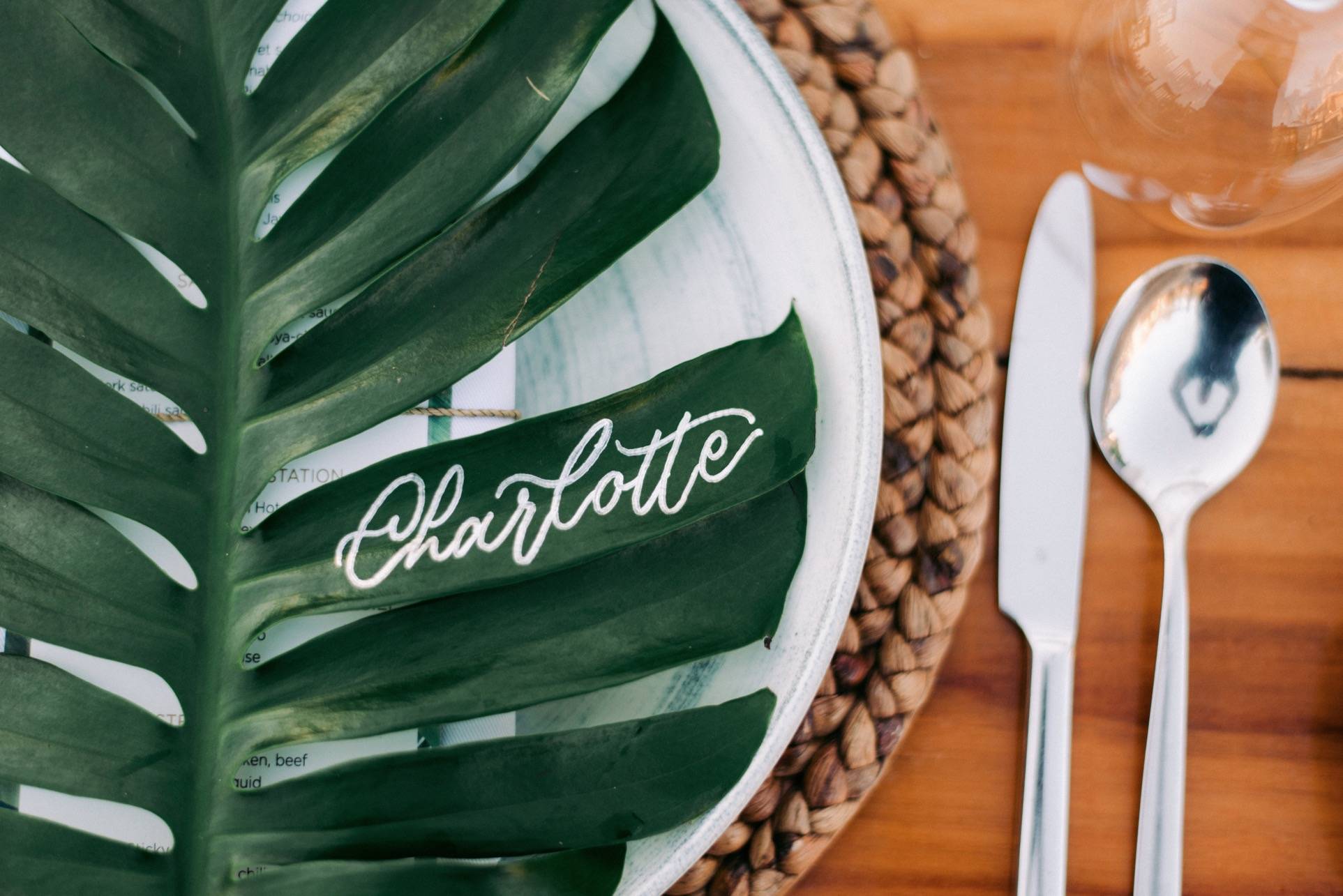 Tema tropikal menjadi salah satu tema yang cocok untuk pesta outdoor wedding dan tentunya di cuaca tropis di mana saja di Indonesia. Agar semakin menyatu dengan alam maka table setting-nya pun didesain lebih selaras dengan nuansa alami, salah satunya dengan menggunakan daun sebagai pengganti placecard. Monstera menjadi salah satu jenis daun yang sering dipakai untuk menonjolkan tema tropis ini sekaligus menjadi penghias showing plate di meja resepsi Anda.