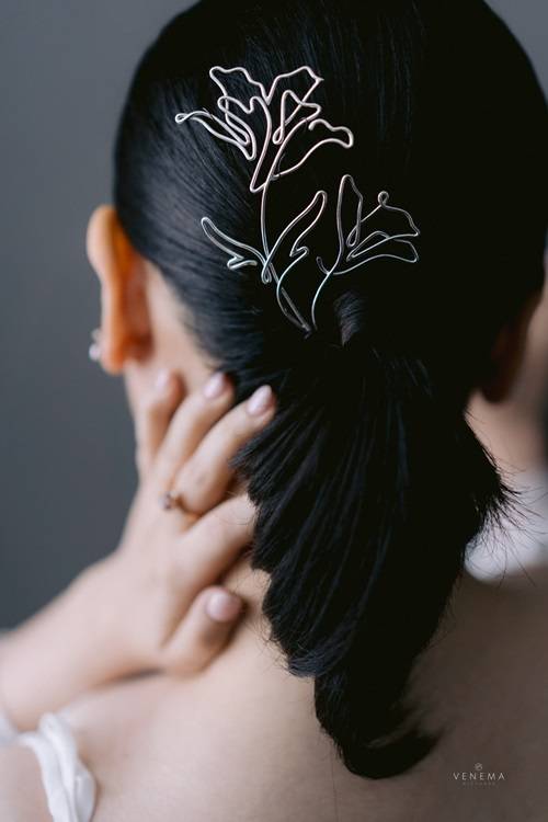 Salah satu keunggulan rambut pendek adalah kemampuannya menonjolkan aksesori rambut. Hairpin berhiaskan mutiara, crystal clip, mini tiara, hingga veil pendek bisa langsung menjadi statement utama dalam bridal look. Penggunaan aksesori yang tepat dapat menggantikan “drama” rambut panjang tanpa membuat tampilan terasa berlebihan. Bahkan satu aksesori kecil di sisi kepala sudah cukup memberi sentuhan bridal yang kuat.