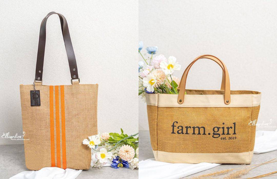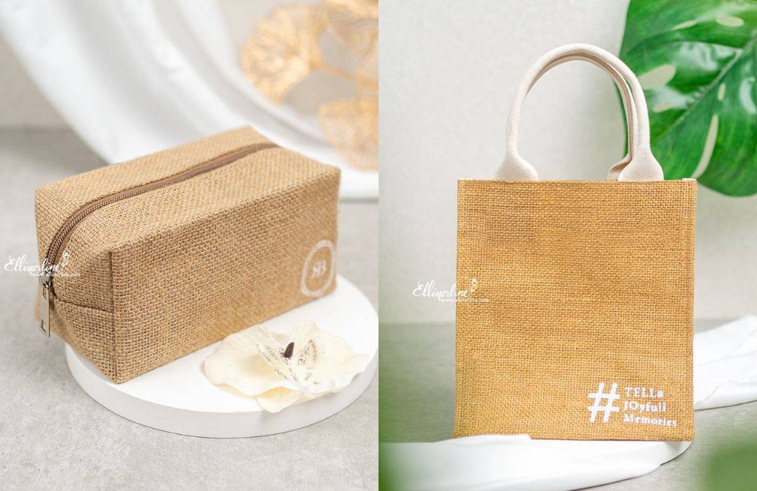 Proses pembuatan totebag atau pouch di bawah ini berasal dari bahan goni. Goni sendiri merupakan serat alami (serat jute) yang dapat didaur ulang karena berasal dari alam. Pembuatannya dimulai dengan preview design lalu akan dilanjutkan saat desain tersebut sudah disetujui oleh client (pengantin). Proses produksi biasanya memakan waktu 1-3 bulan. Untuk minimal pemesanan 50 pieces, vendor menyarankan untuk memesan 6 bulan sebelum pernikahan berlangsung.