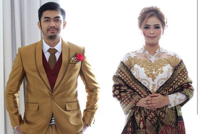 Pada foto ini, setelan jas warna maroon terlihat sangat pas dipadu dengan busana pengantin warna putih. Maroon membuat Anda terlihat stylish dan percaya diri.