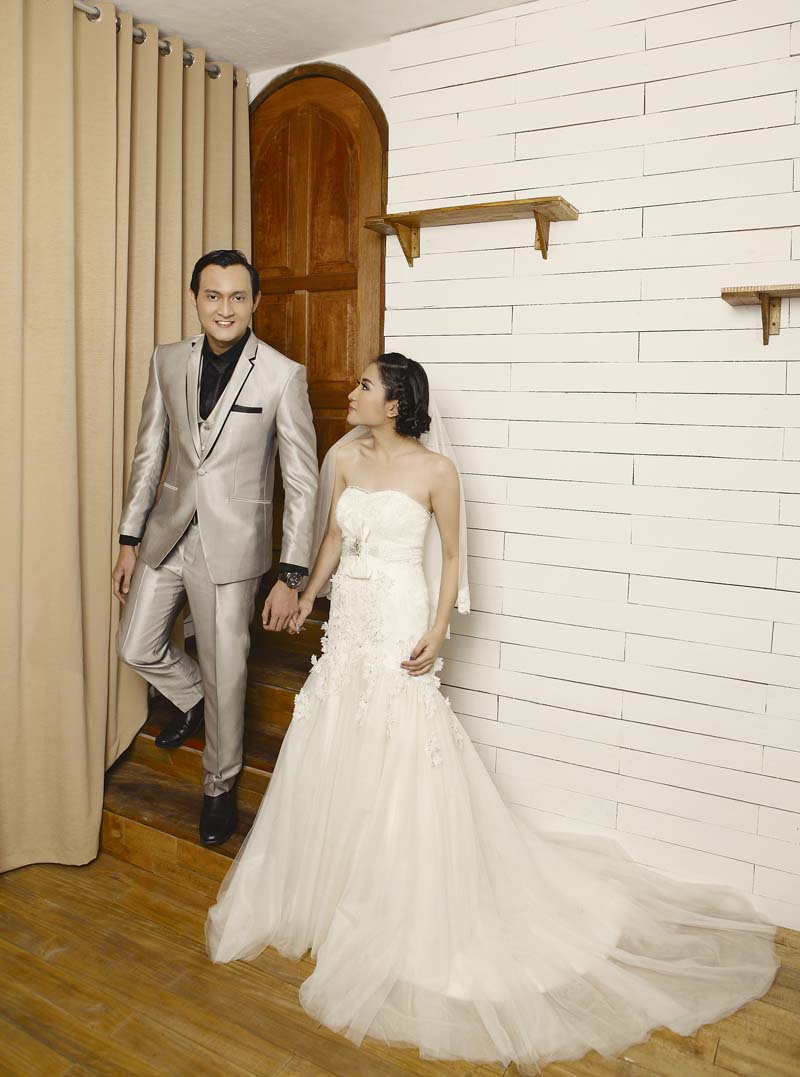 SUIT jas pengantin berwarna silver memunculkan kesan mewah untuk pemakainya. Padanan kemeja hitam pun menjadi pilihan baru untuk hari bahagia Anda. Jas warna champagne yang dipakai bersama kemeja putih, tampak sangat stylish dan modern di tubuh Irvan.