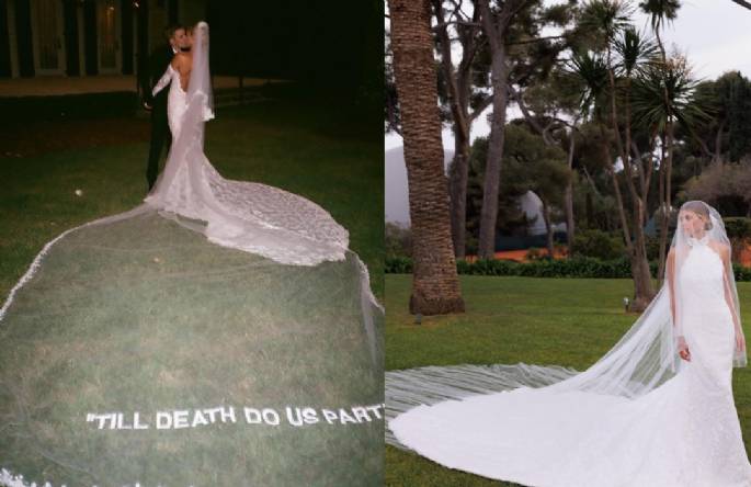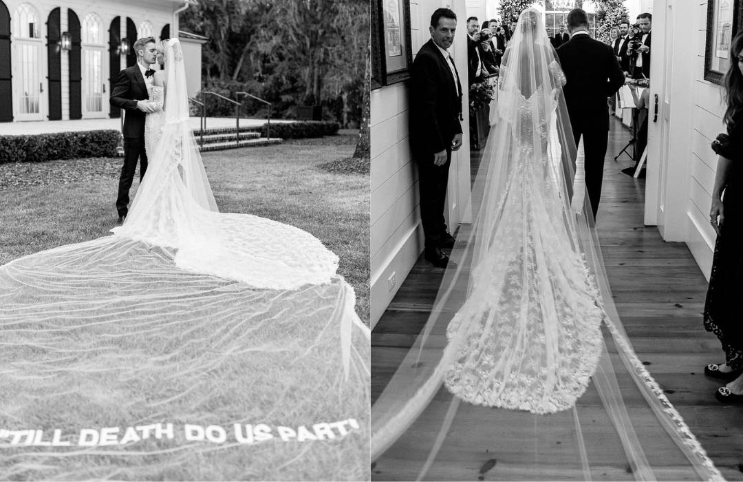 Hailey Bieber menikah dengan Justin Bieber menikah di tahun 2019 mengenakan gaun dan veil desain dari Virgil Abloh dari Off-White. Veil ikonik dengan tulisan “‘TILL DEATH DO US PART” menjadi buah bibir di internet karena keanggunan dan keunikannya.