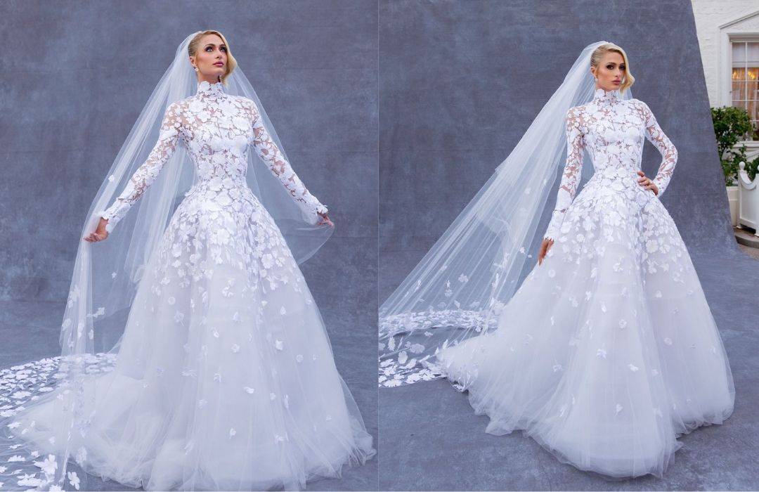 Paris Hilton mengenakan gaun dan veil menawan dari Oscar de la Renta Atelier New York yang keduanya dibuat oleh 8 modiste selama 1.400 jam dengan desain pressed flower embroidered.