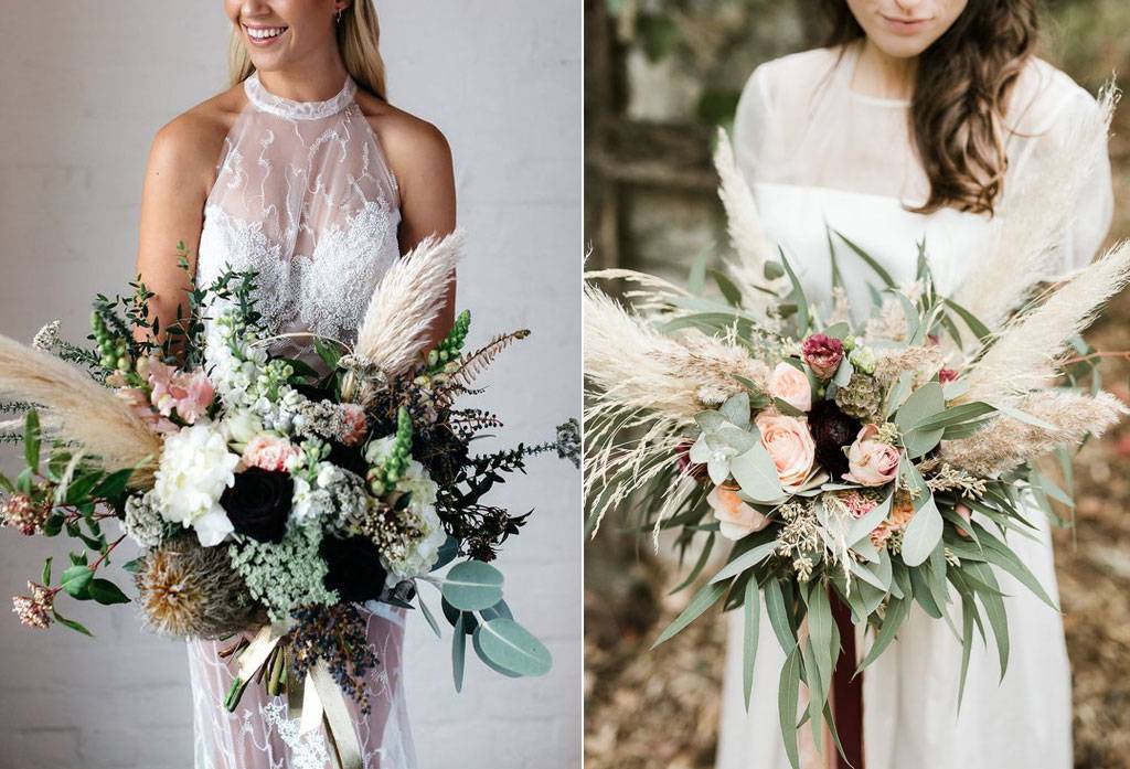 Sudah dibahas di atas, bentuk hand bouquet masih dipegang asymetric hand bouquet. Tidak beraturan dengan ukuran agak besar tidak berubah menjadi hand bouquet yang diminati. Untuk mengkomposisikan pampas grass dapat disertai wild flowers yang tepat untuk berbagai tema pernikahan. Ada pula yang menyatukannya dengan berbagai jenis daun semacam eucalyptus yang membuat makin bervariasi.