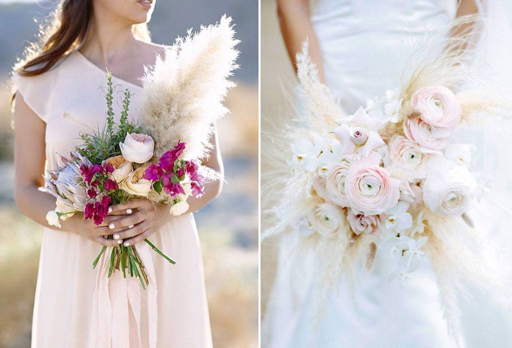 Tidak hanya hinggap pada dekorasi, pampas grass juga menyertai hand bouquet. Setelah tren menggunakan daun eucalyptus berakhir, kini berganti dengan pampas grass yang memberi sentuhan kuning keemasan pada gradasi warna hand bouquet.