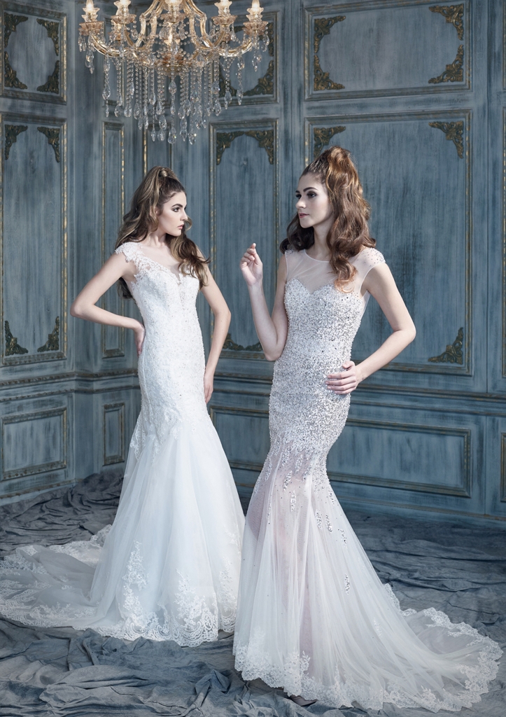 Gaun mermaid dengan berkerah tinggi disertai cape yang unik dan memperjelas lekukan tubuh dengan sempurna.